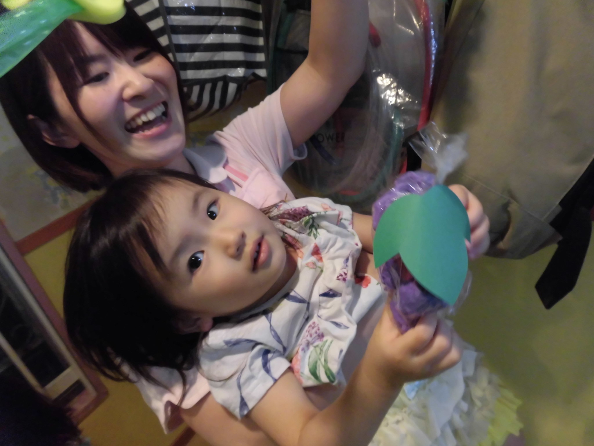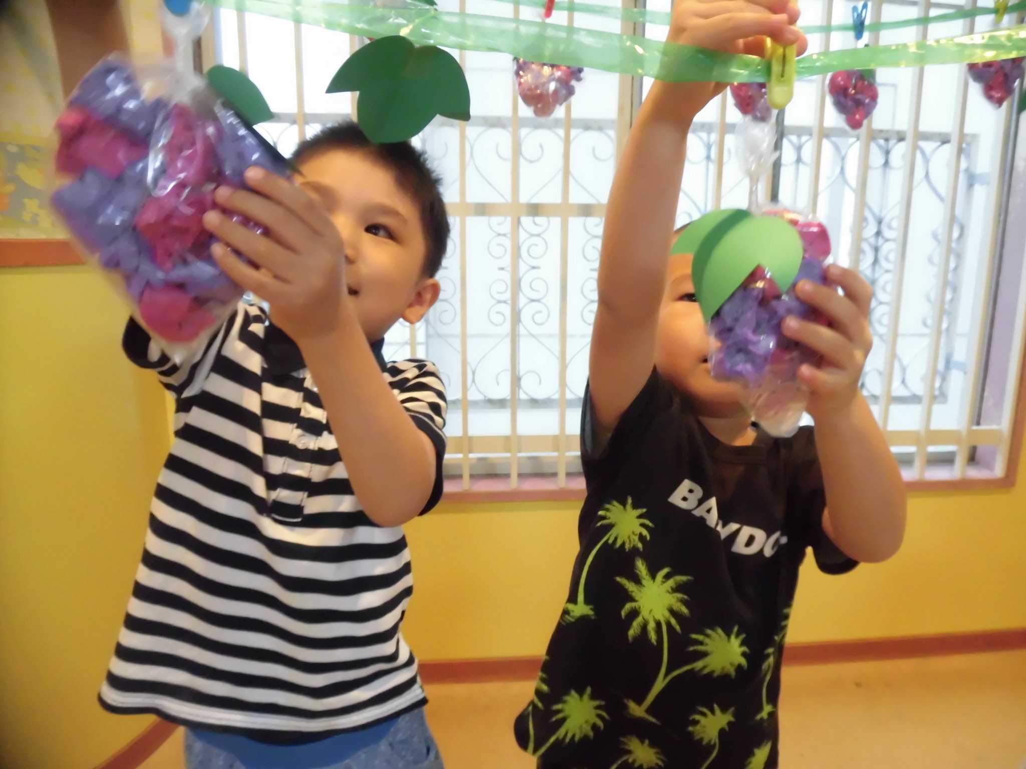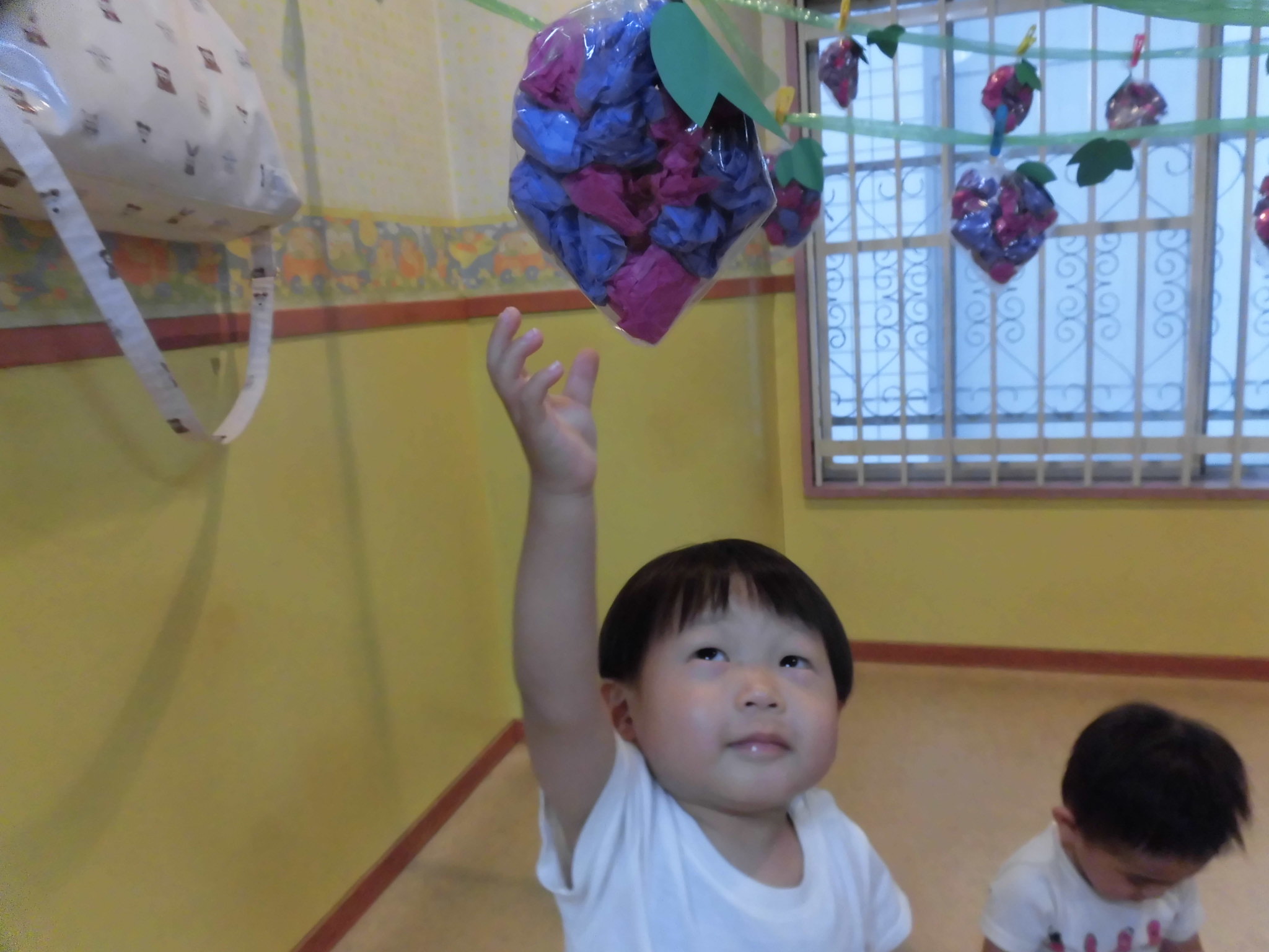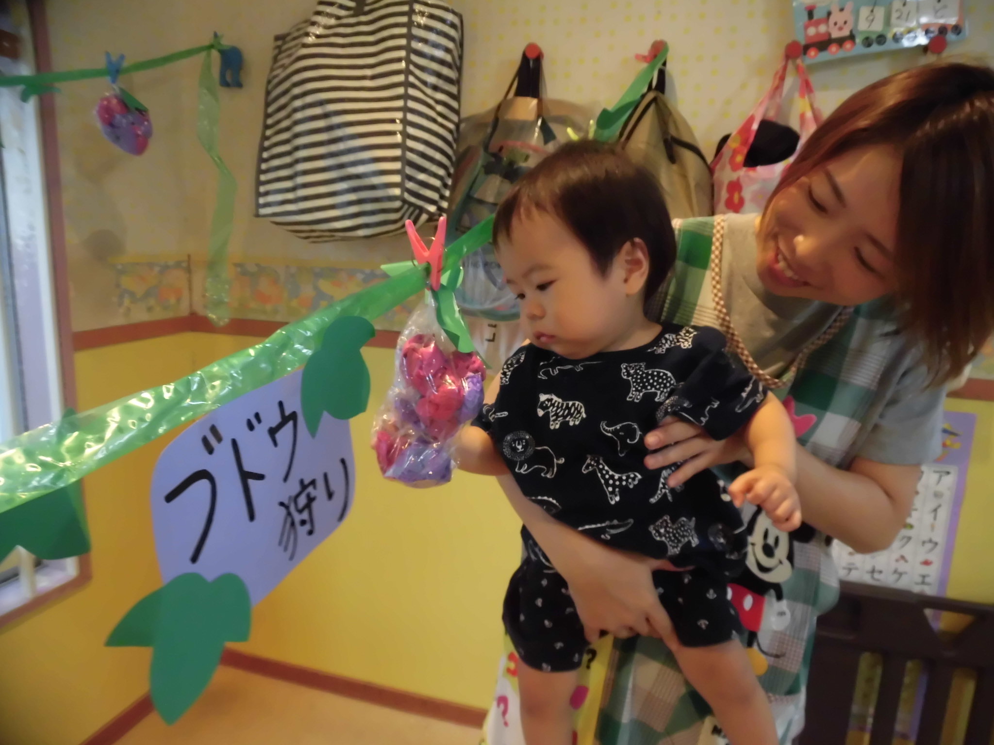 小さい子は保育士に抱っこされ、ぶどうをギュッと引っ張りながら獲り、