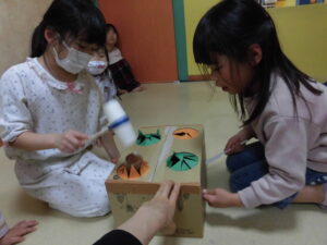 少し難しくて、出し入れするスピードがゆっくりめだったので、最後に保育士が早いスピードですると、キャーキャー言いながら楽しんでいましたよ😁