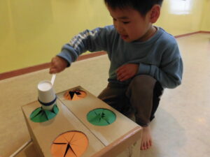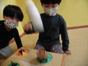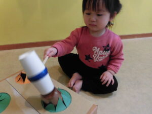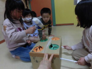 少し難しくて、出し入れするスピードがゆっくりめだったので、最後に保育士が早いスピードですると、キャーキャー言いながら楽しんでいましたよ😁