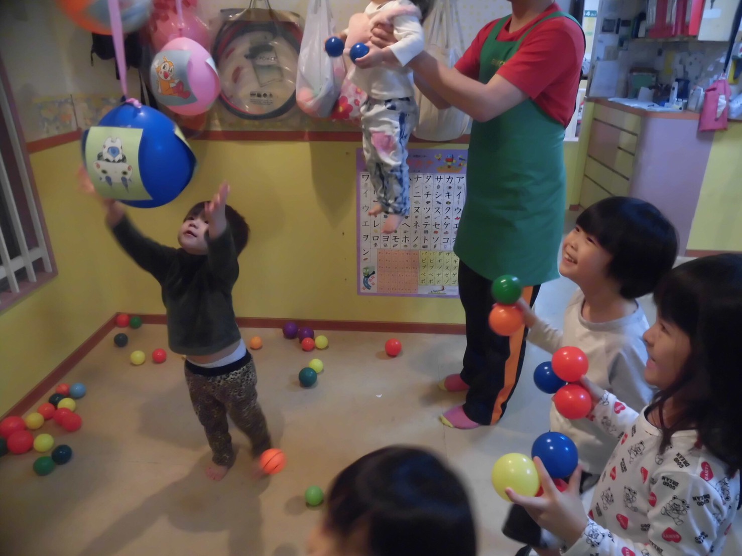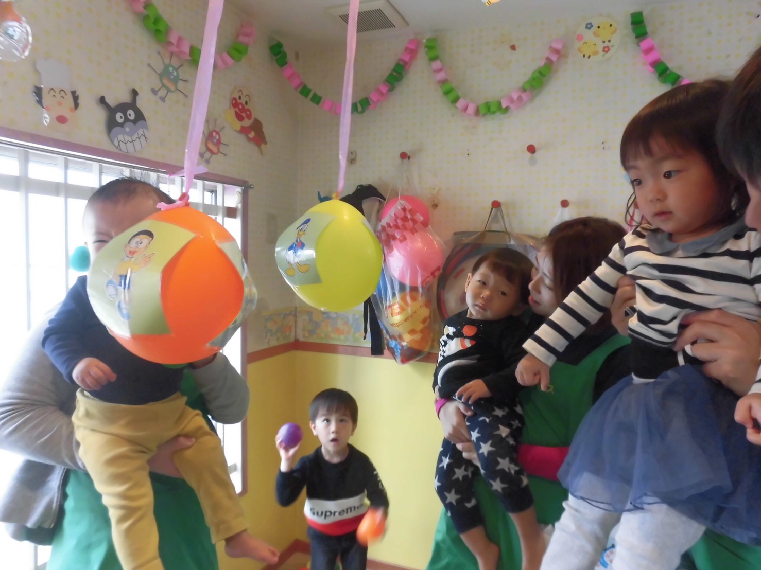 風船にキャラクターカードを貼った物を吊ってボールを当てて落とすゲームをしました☆