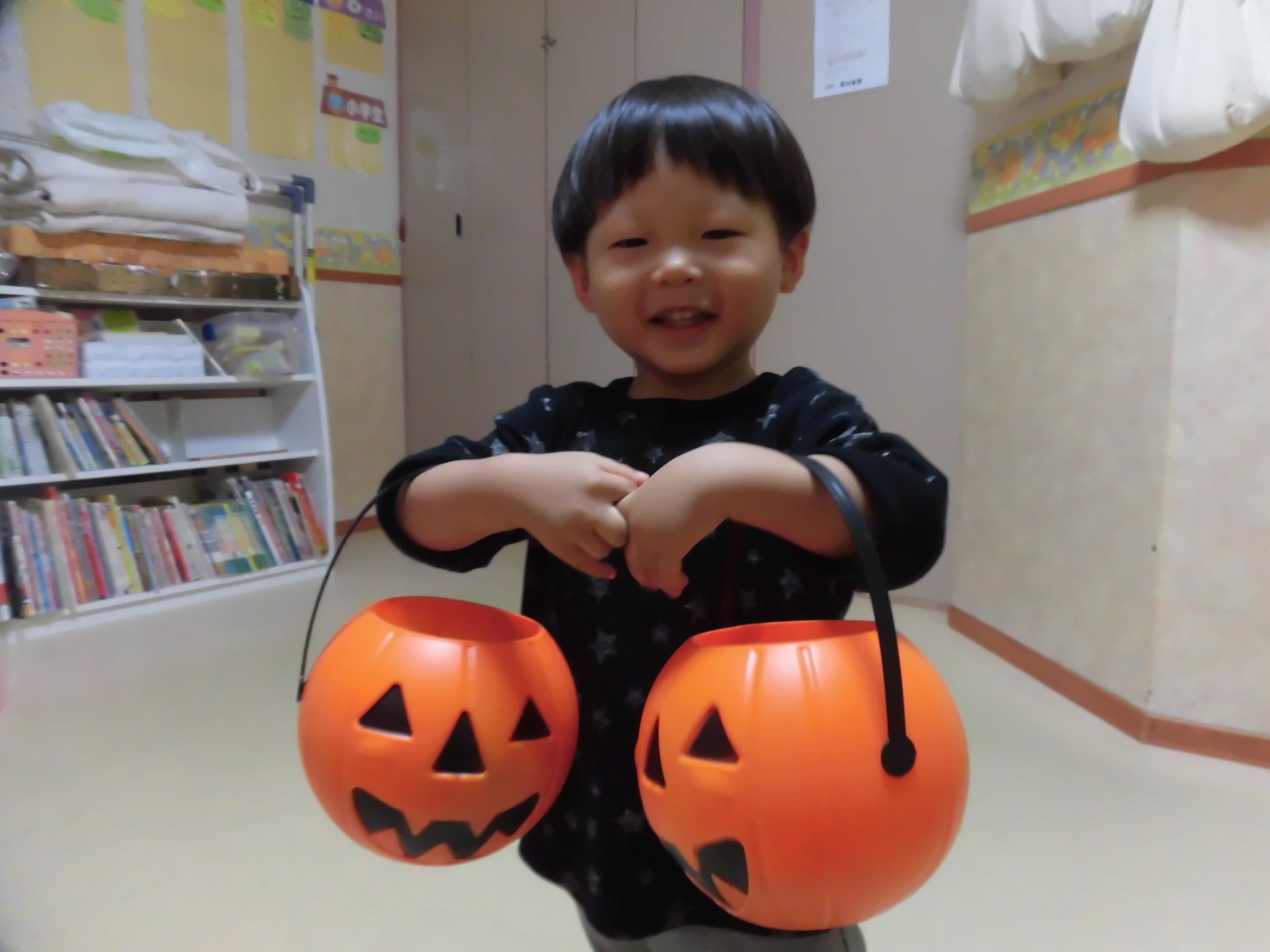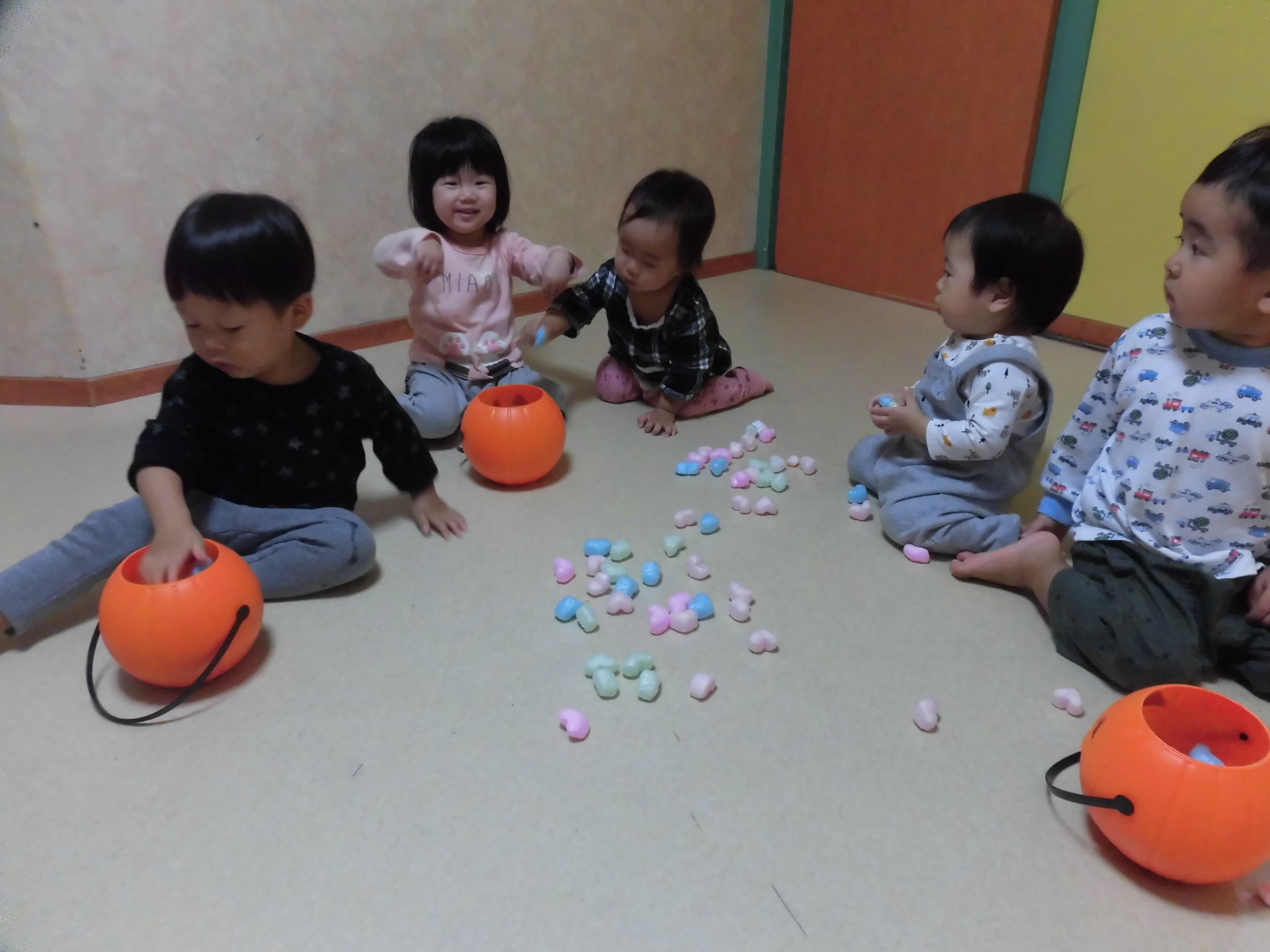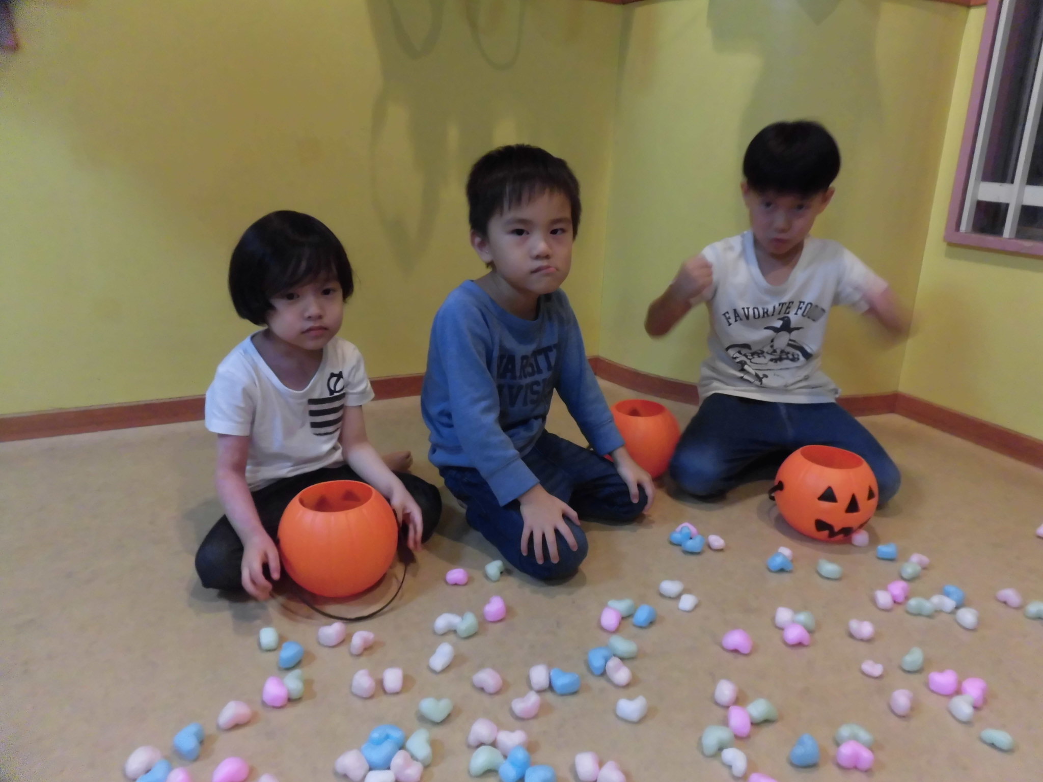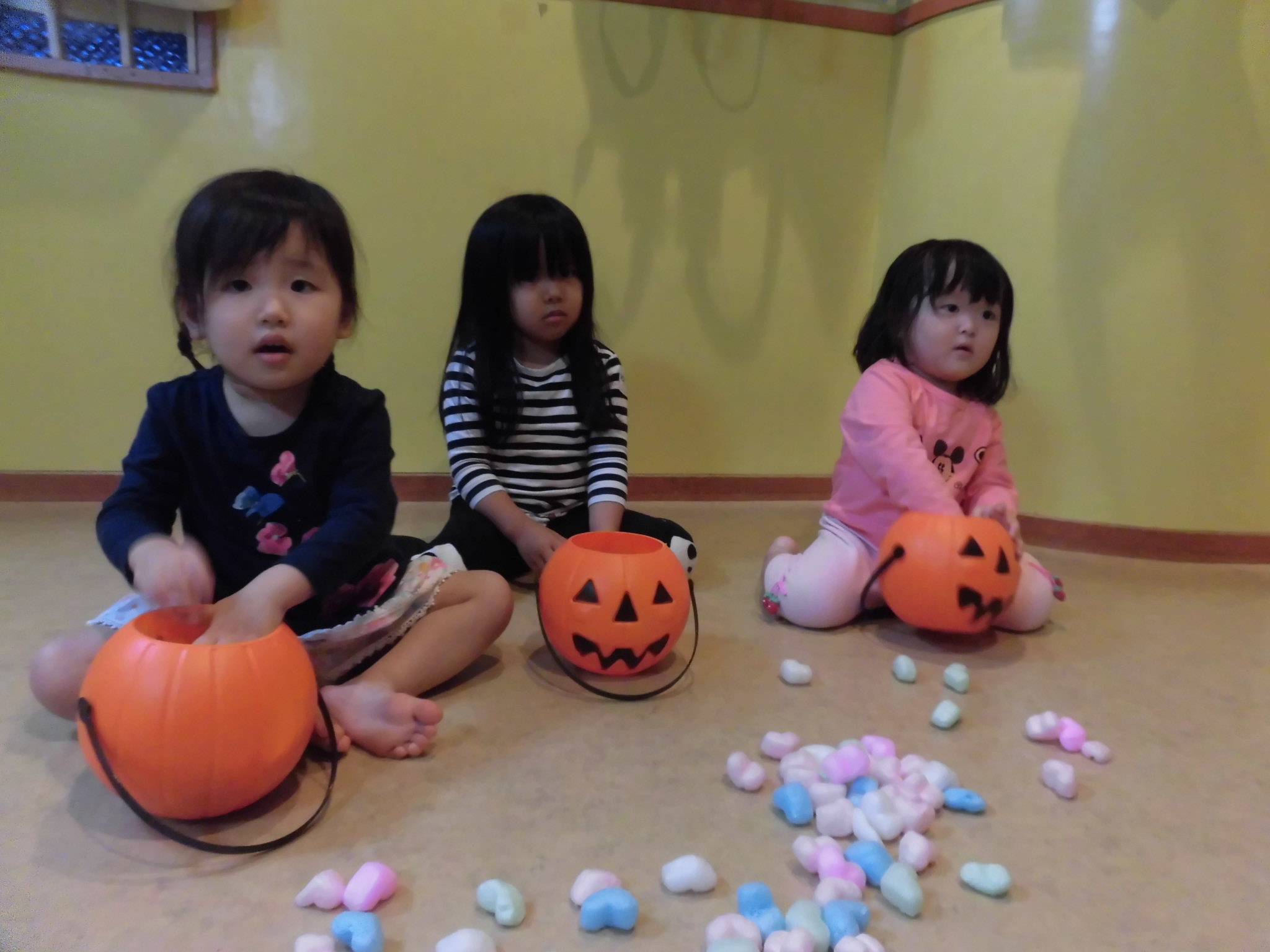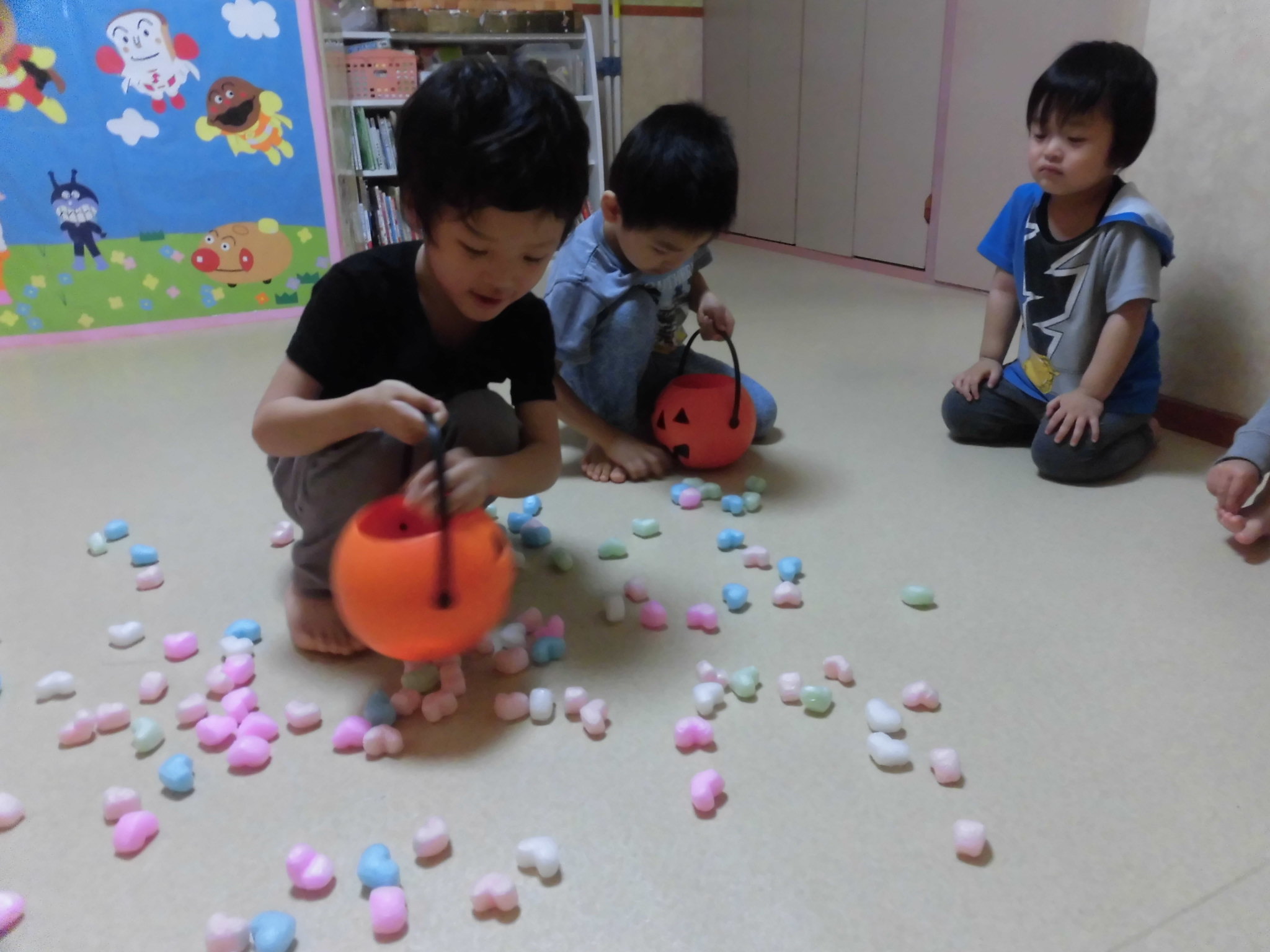 カボチャのカゴを持ってキャンディー型のスポンジを集める競争をして遊びました☆