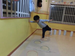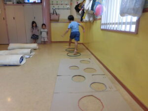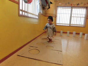穴の周りをクレヨンで色をつけていたので「あか」「みどり」と色を言いながら進んでいたのが可愛いかったです🥰