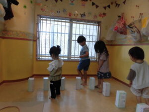 間隔を空けて置いたティッシュ箱に当たって倒さないように進んでいきます!