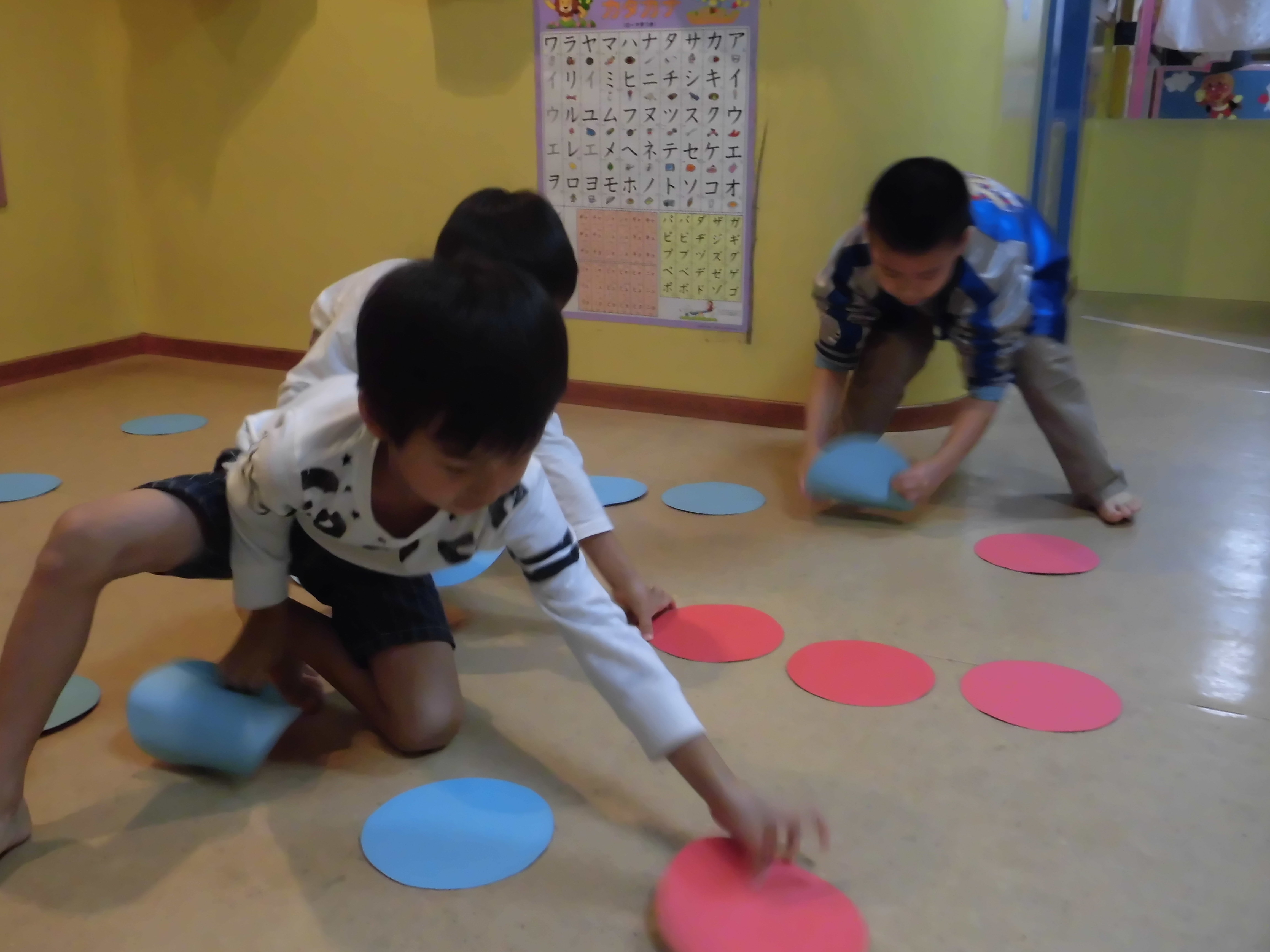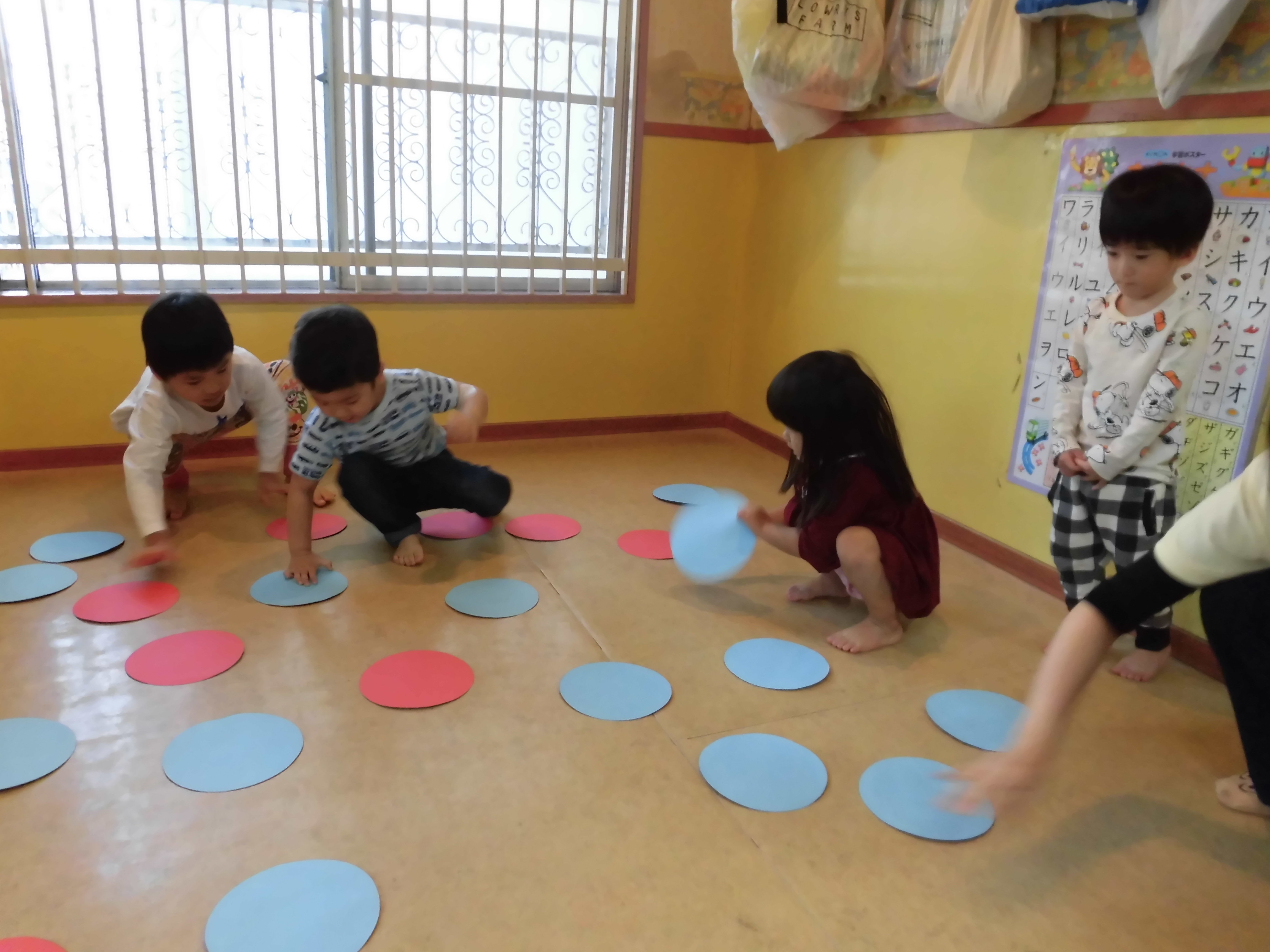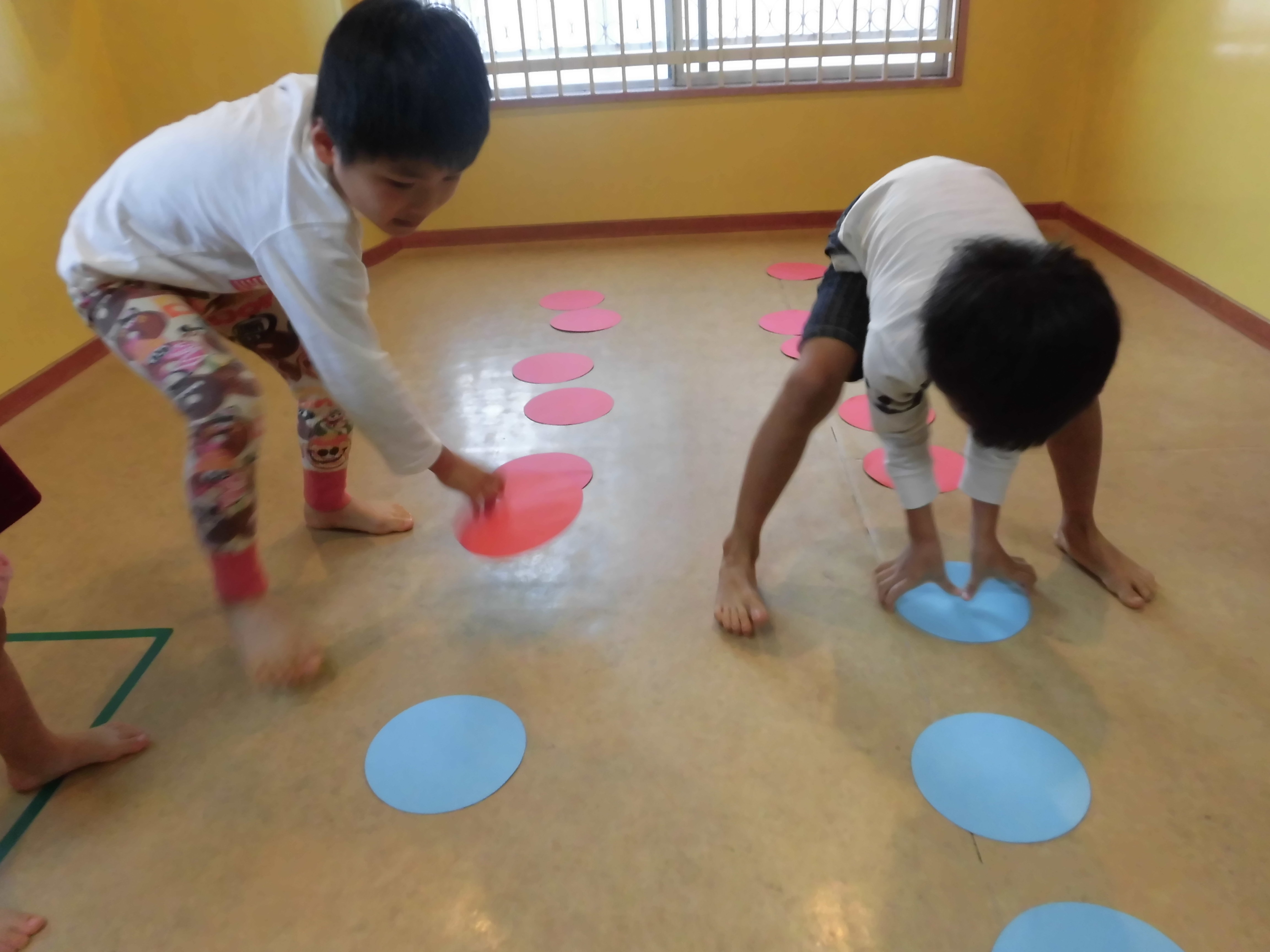 「よーいどん!」の合図で並んでいる丸い画用紙をひっくり返して進み、ゴールを目指します!