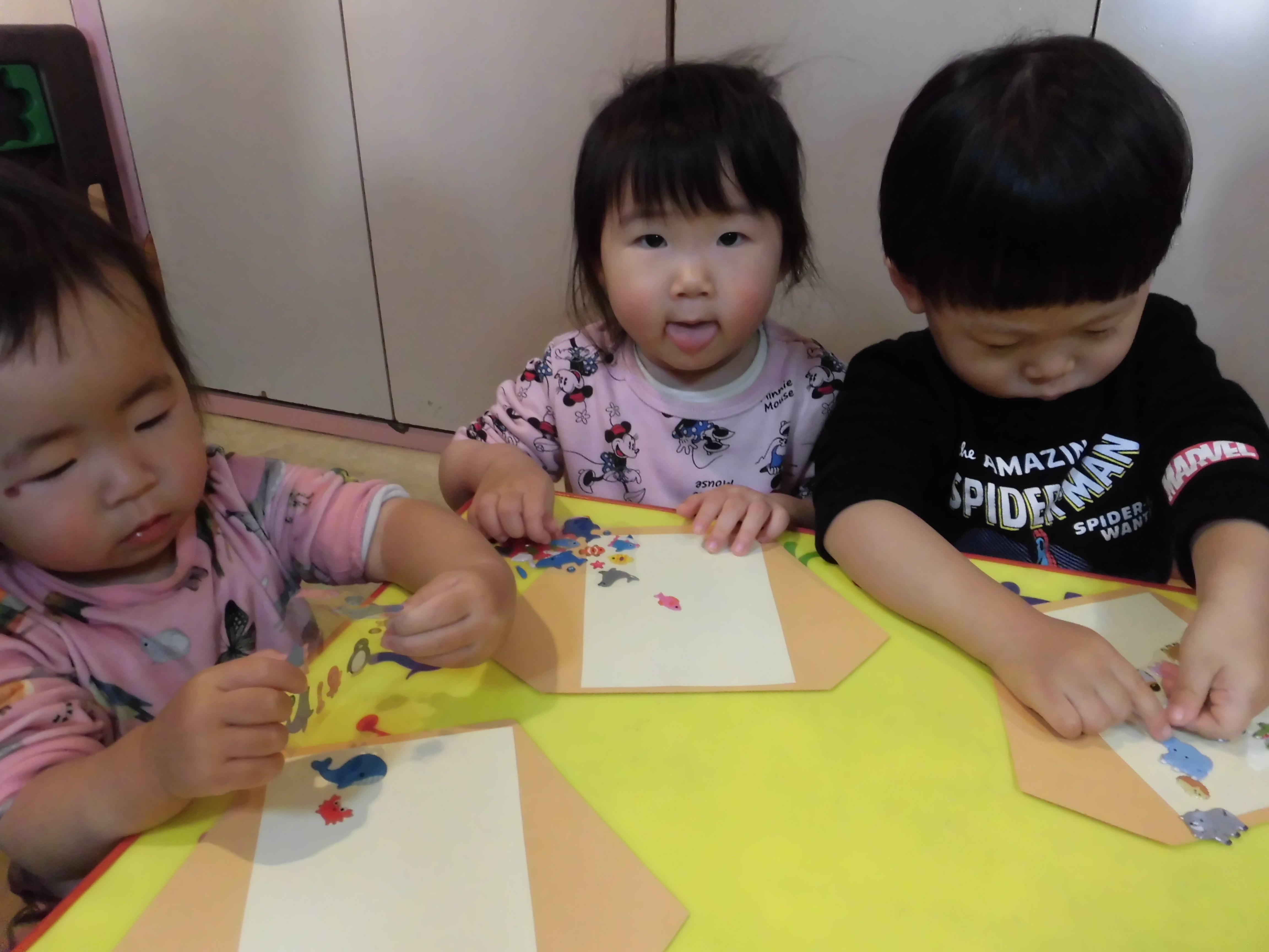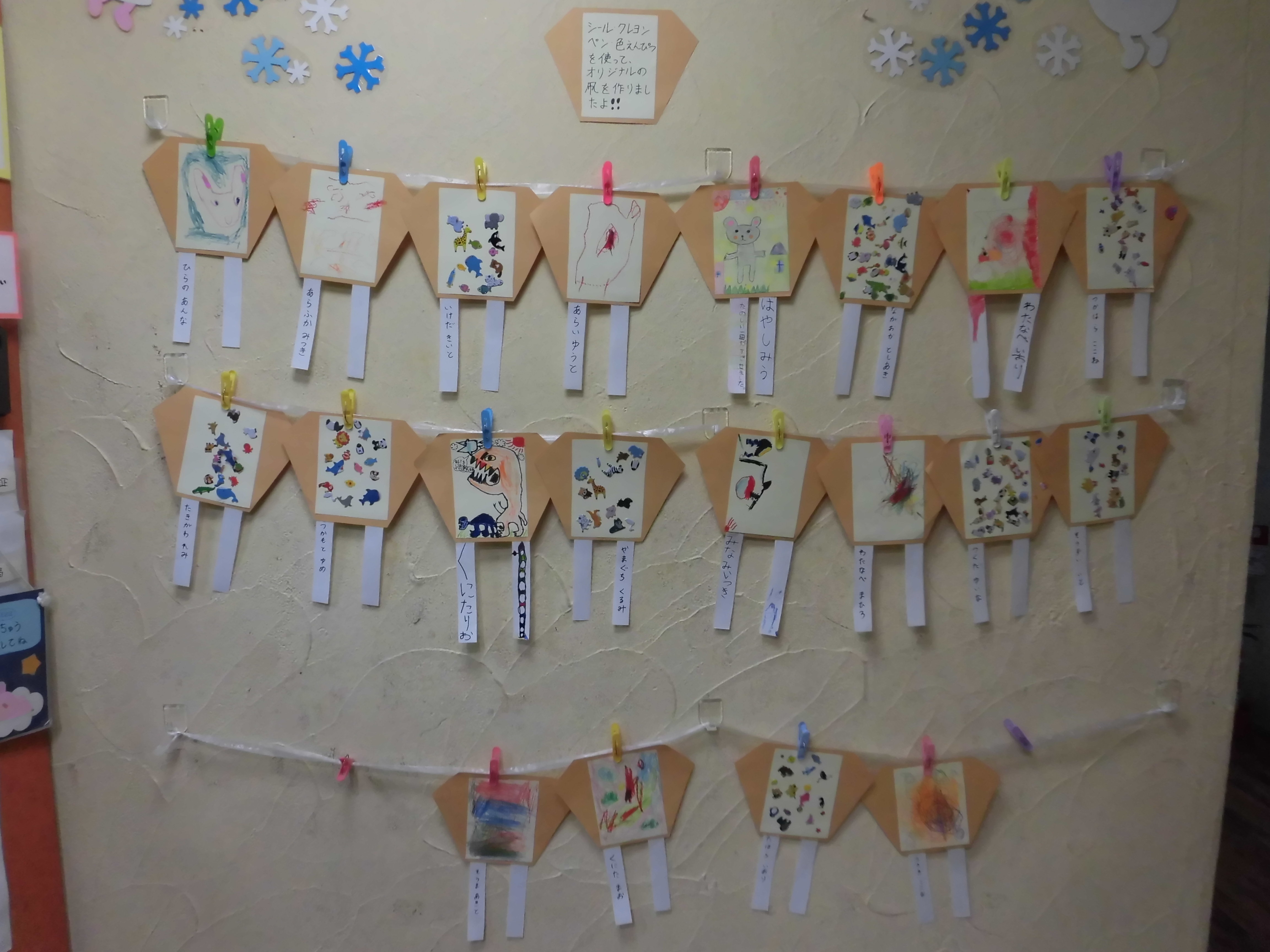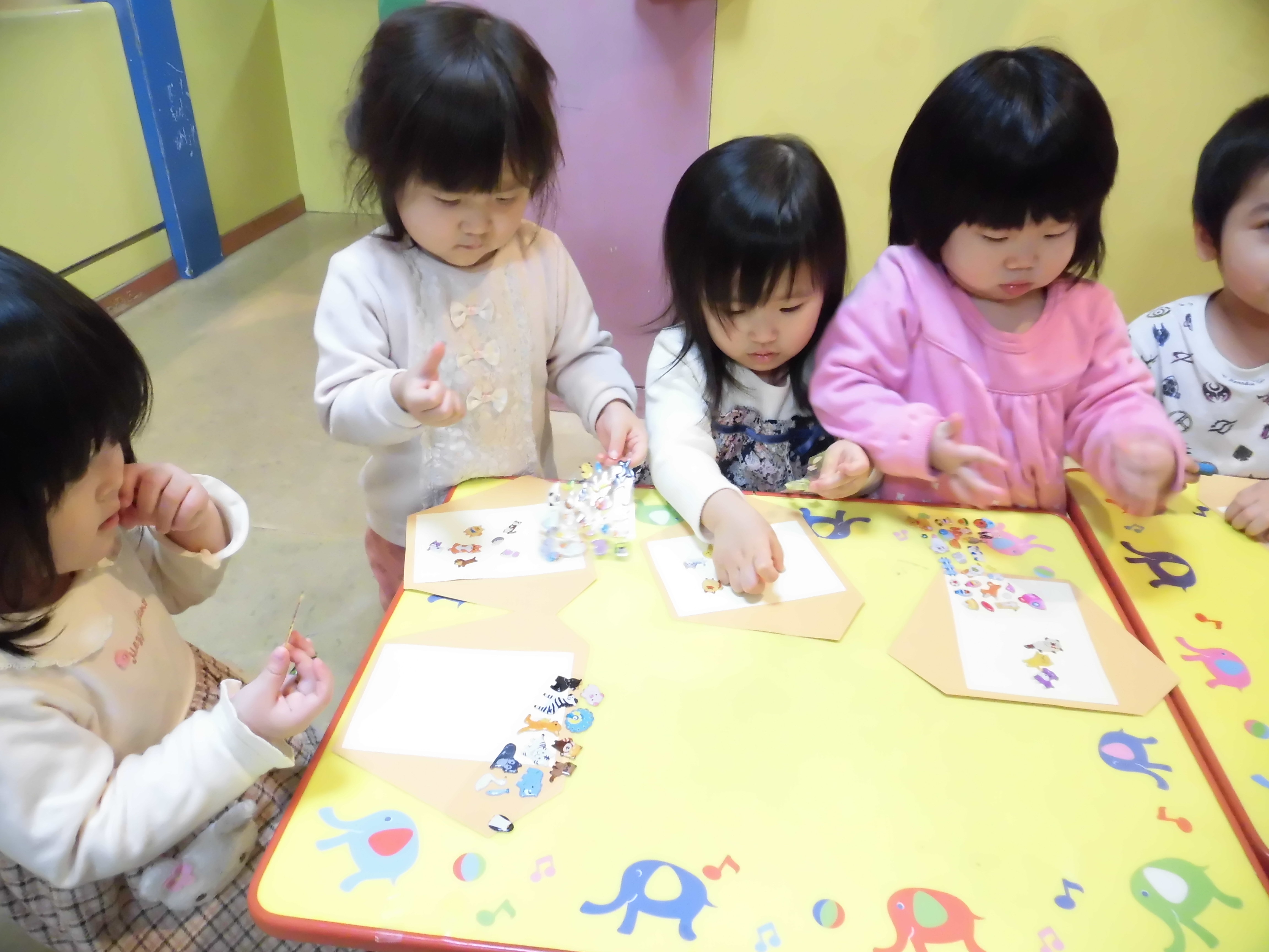 小さい子はシールを貼って、大きい子はペンやクレヨンで絵を描きました(^ω^)