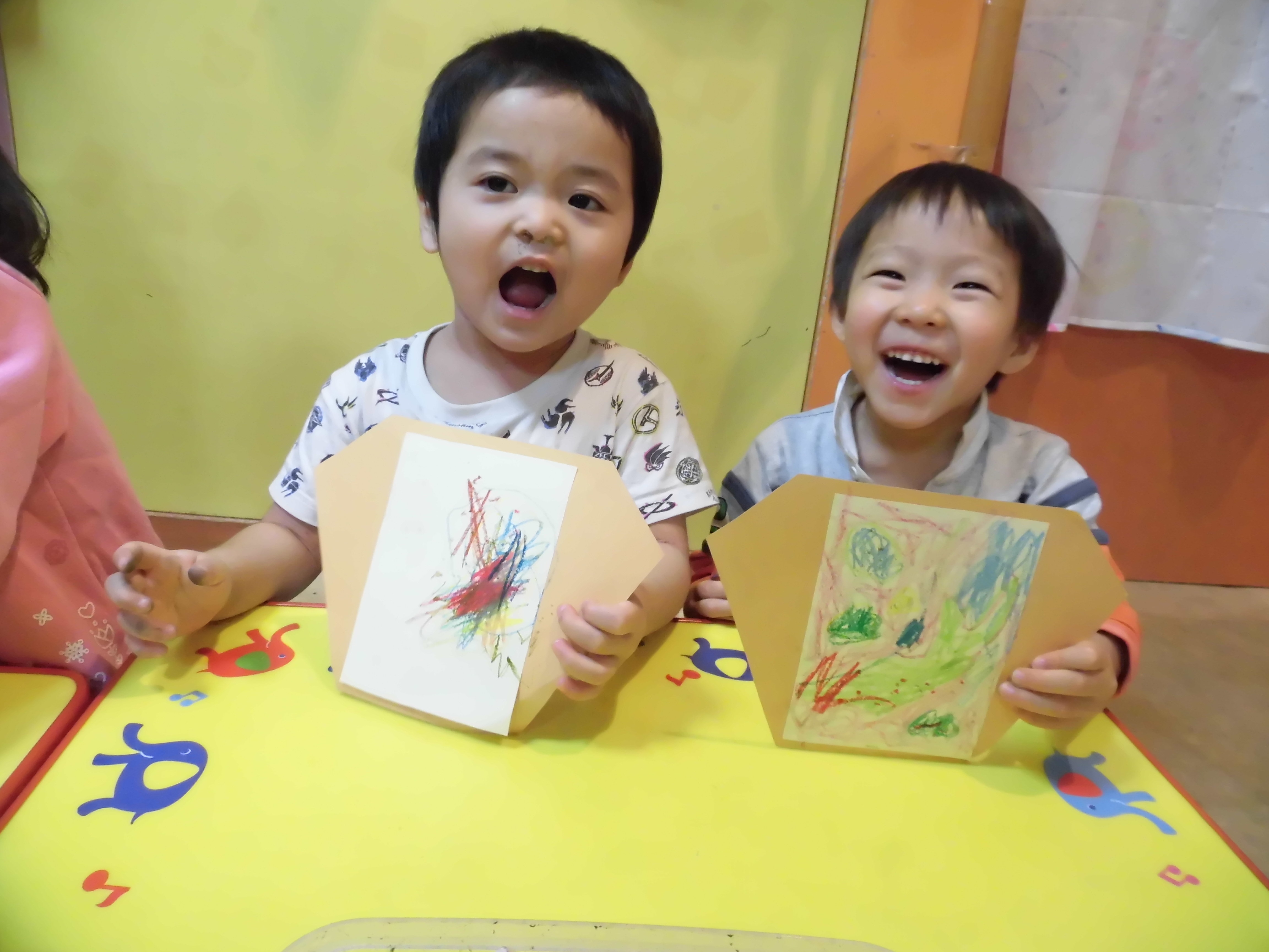 絵を描いていた大きい子達は、車を描いたりウサギを描いたりと、それぞれが描いた絵をお友達と見せ合いっこしていました(*^^*)