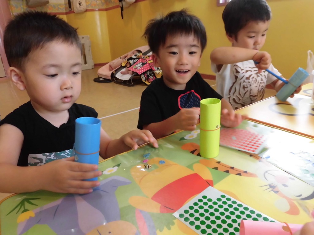 小さい子はシールを貼り、大きい子はペンを使ってオリジナルの弓矢を作りました?