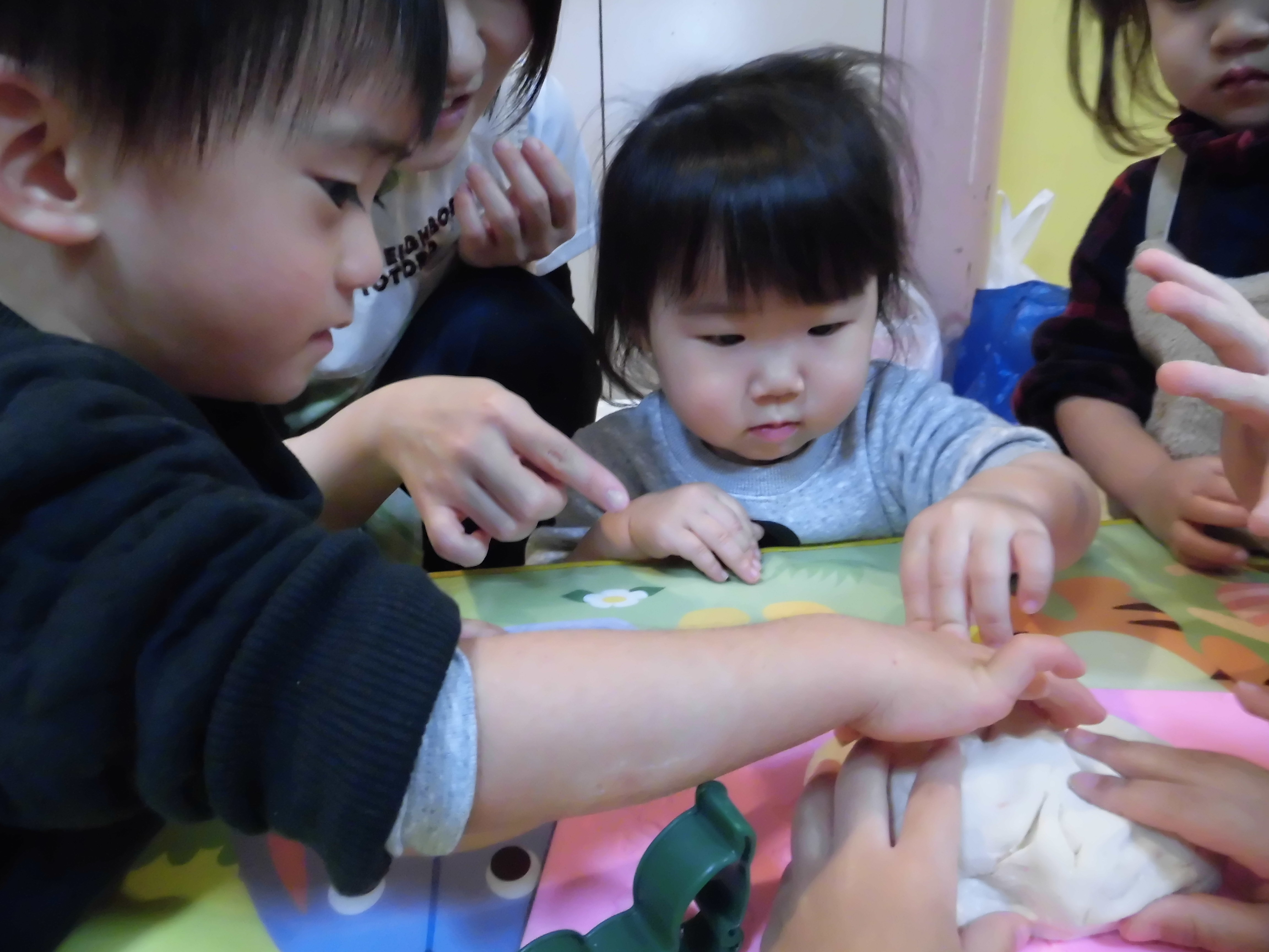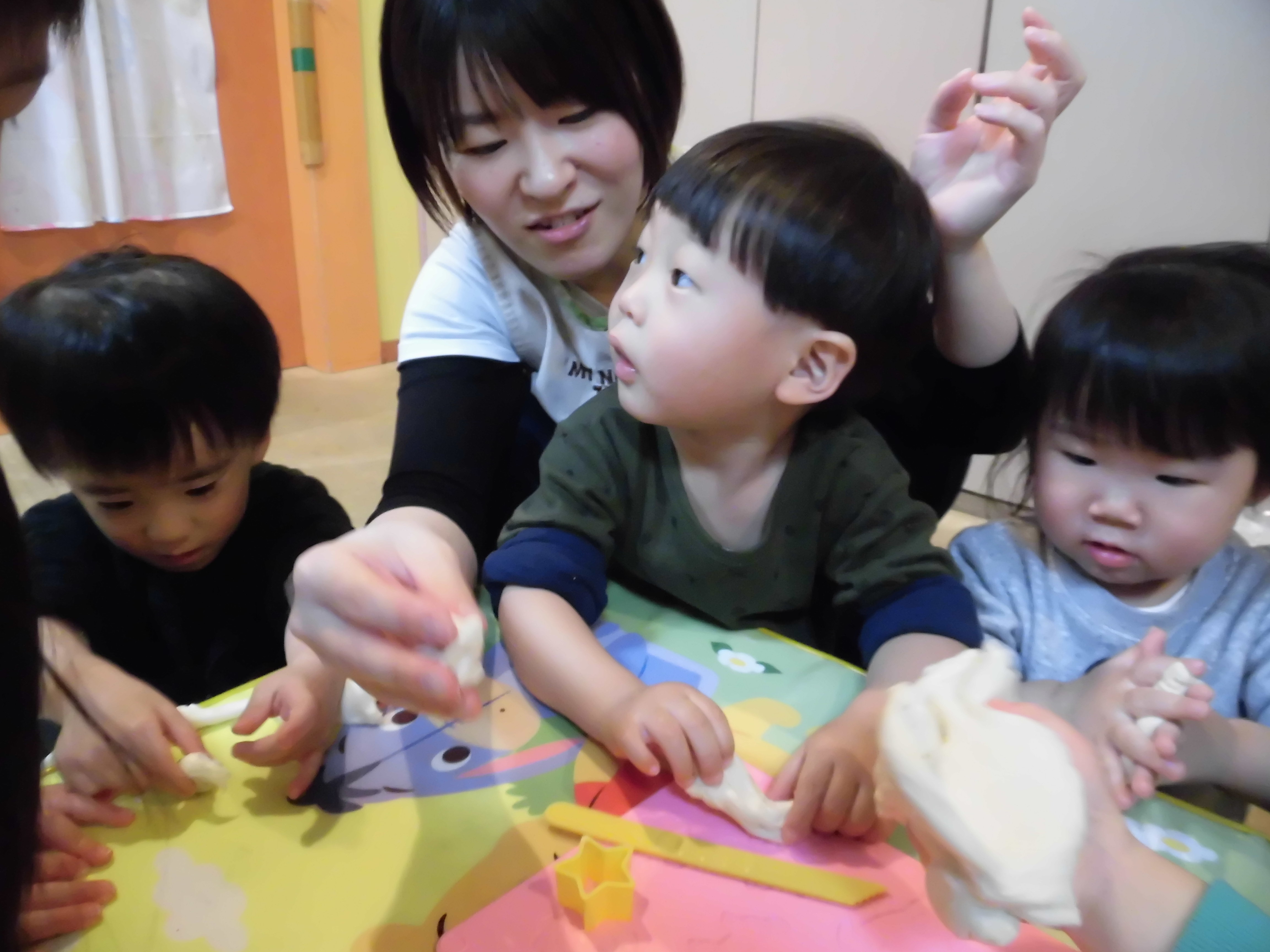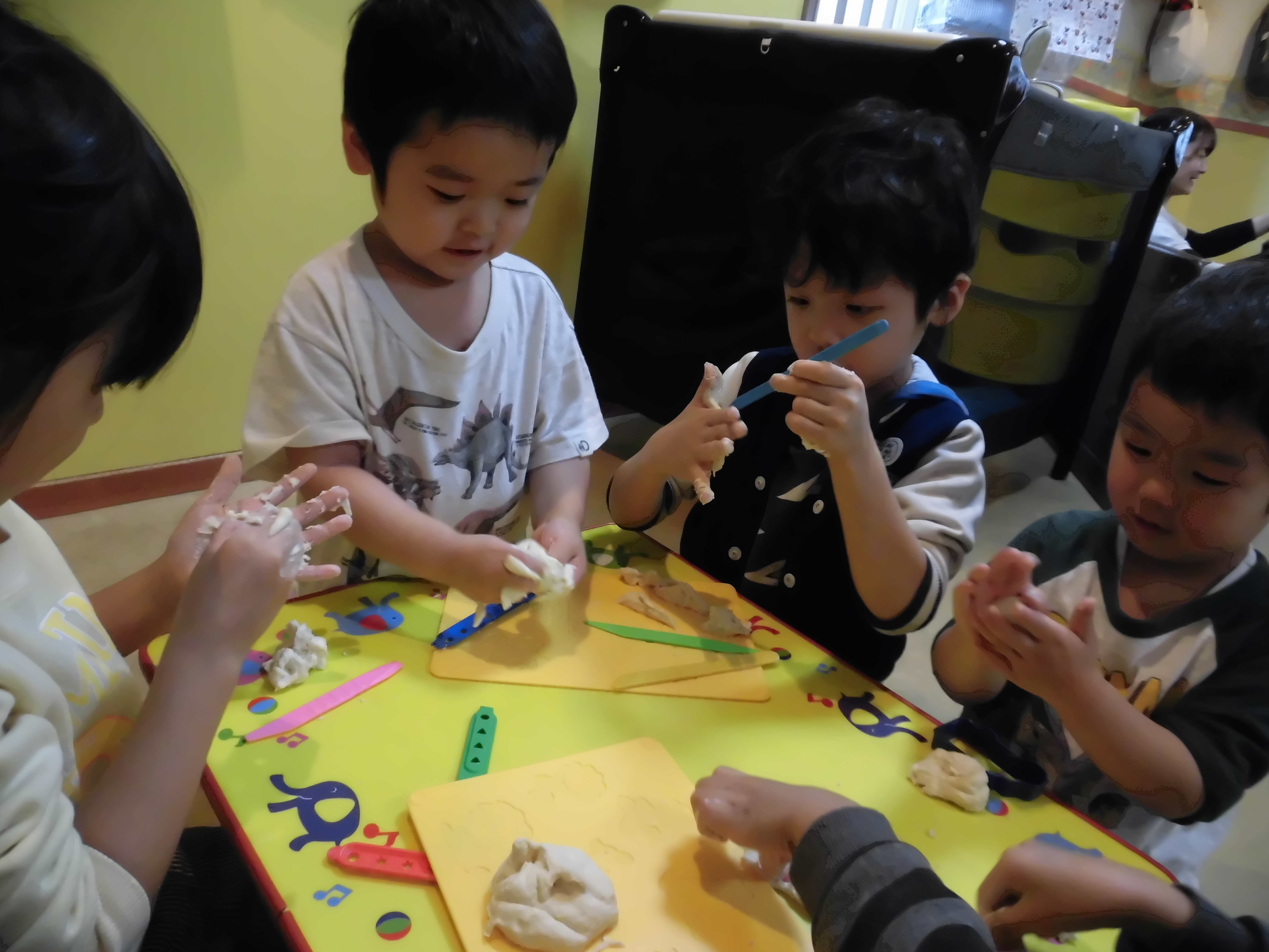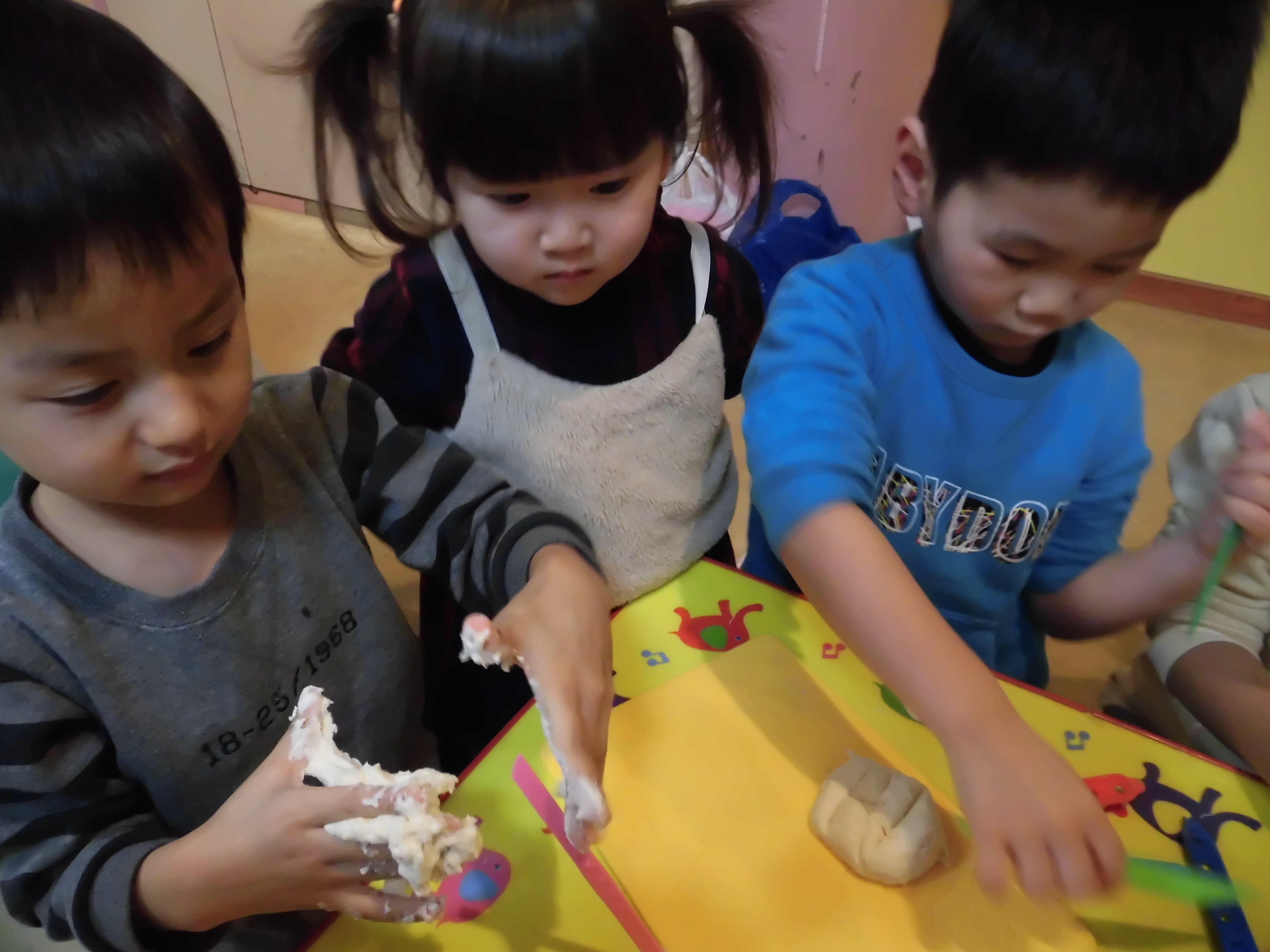 子ども達に小麦粉と水をこねてもらい、粘土を作りましたよ?