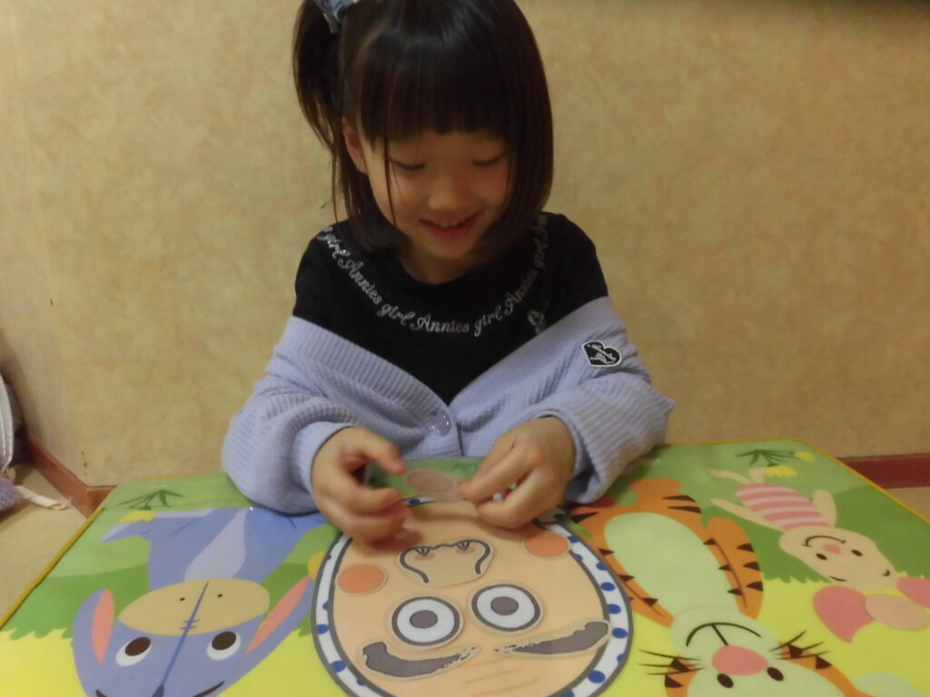 小さい子は見本をみながら、頑張って目や口などを乗せてお顔を作っていました♪おかめさんの顔が少し怖いかな?と心配でしたが、みんな泣かずに興味津々でやってくれてたので安心しました😊