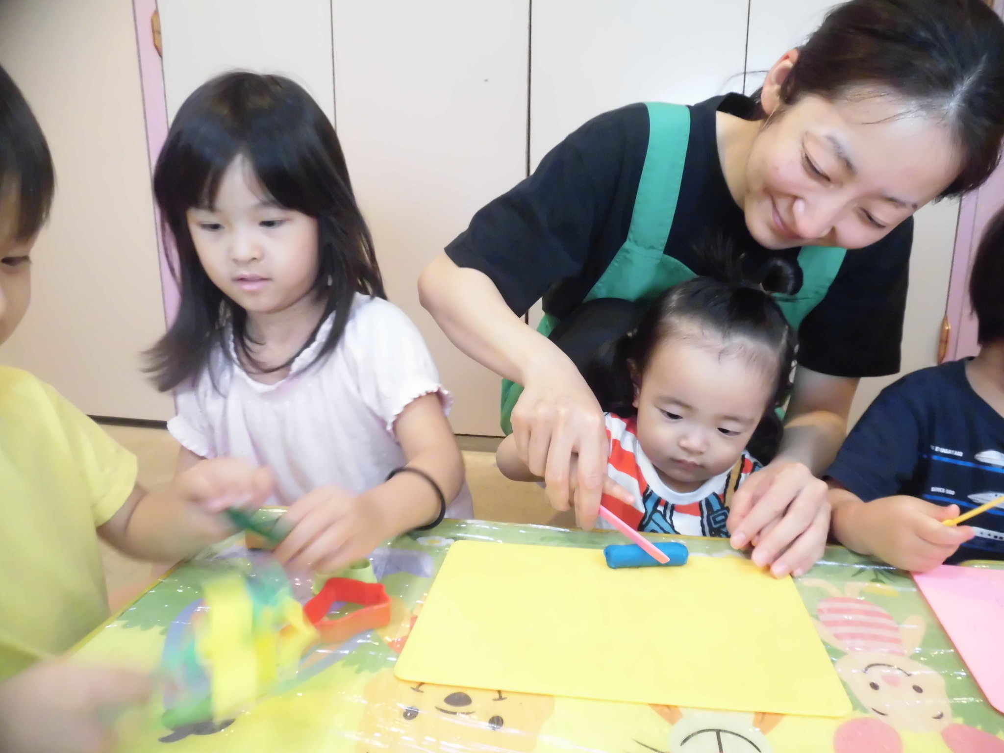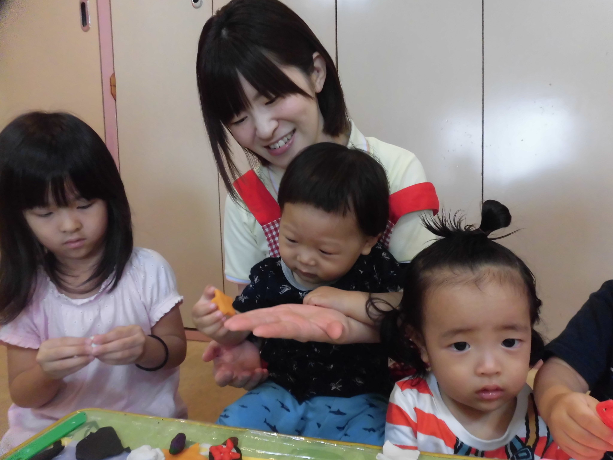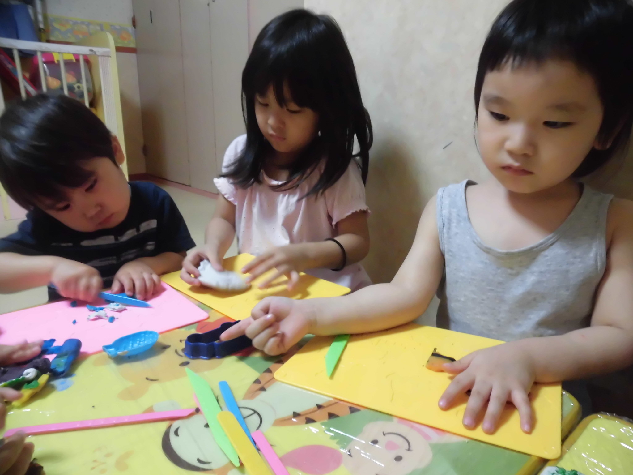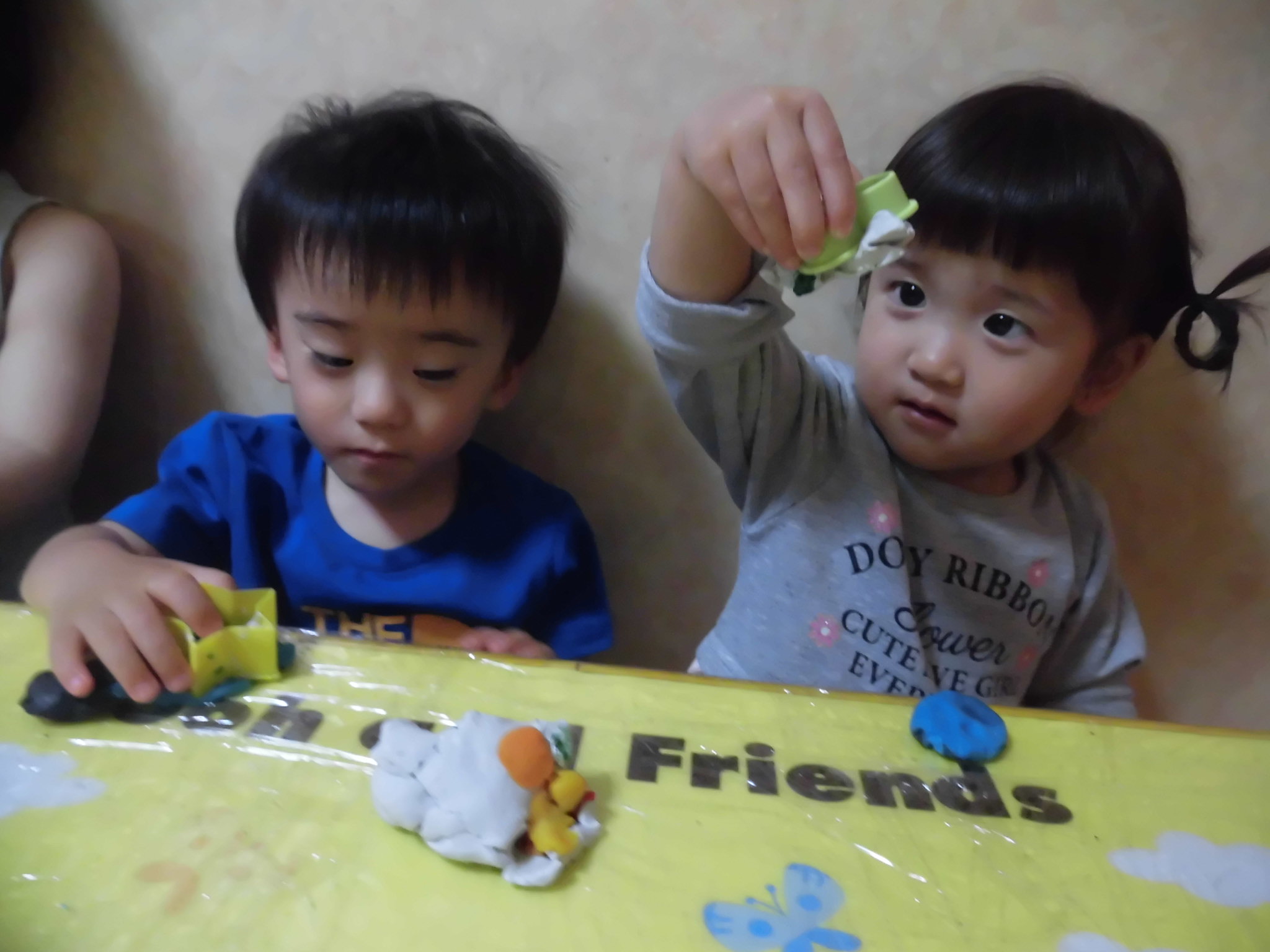 まずは叩いて潰したり、丸めたり切ったりと様々に遊ぶ姿が見れました。