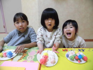 カラフルな粘土を丸めてお団子にする時に、「コネコネ〜混ぜてコネコネ〜♪」とノリノリでオリジナルソングを唄いながら作っていて、とても可愛いかったです♡