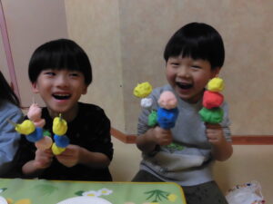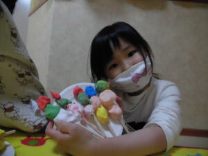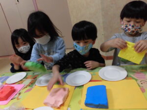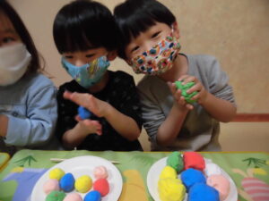 カラフルな粘土を丸めてお団子にする時に、「コネコネ〜混ぜてコネコネ〜♪」とノリノリでオリジナルソングを唄いながら作っていて、とても可愛いかったです♡