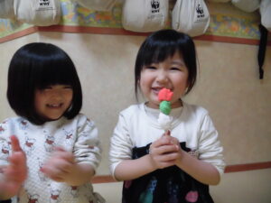 最後は串に刺して三色団子にしてお皿にのせて、美味しそうに出来上がりました( ^∀^)