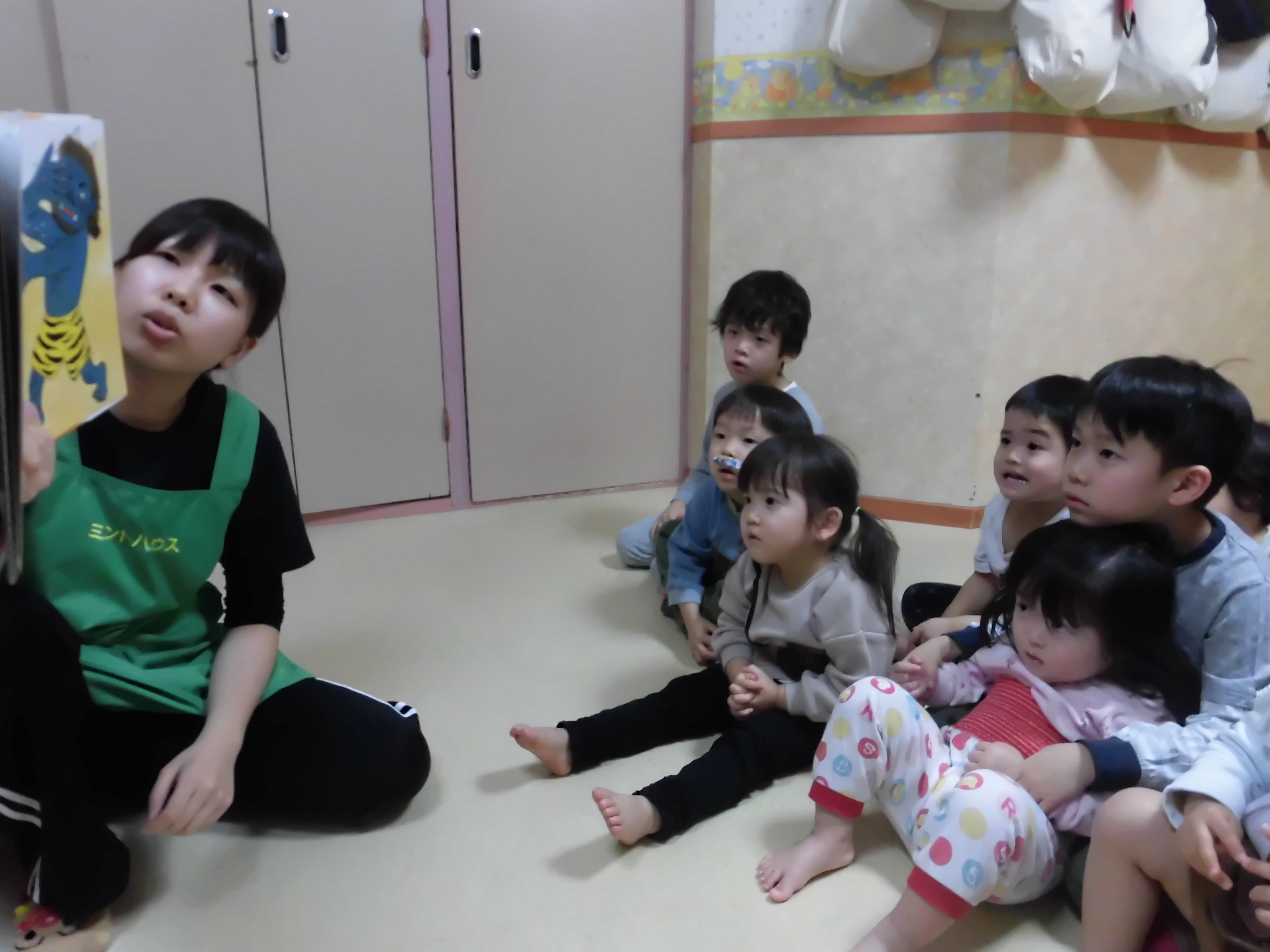 最初は節分がどういう日か「せつぶんセブン」の絵本を読みました。みんな集中して聞いていました!