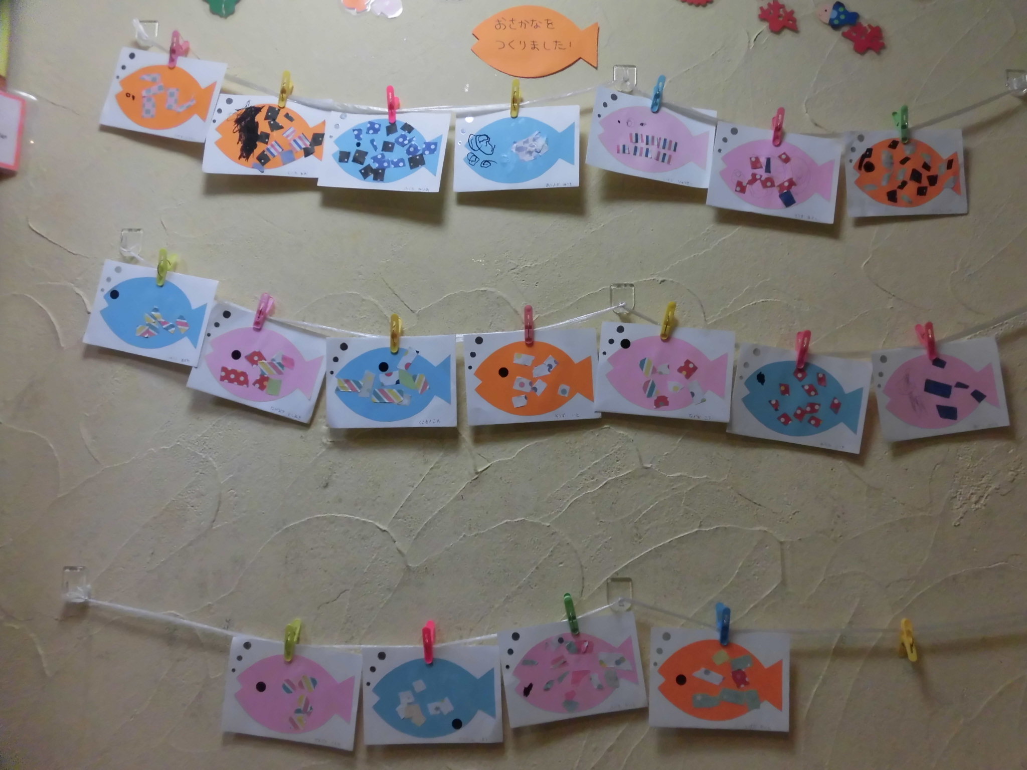 小さい子は、折り紙をちぎってお魚の台紙に鱗のように貼りつけていきました!