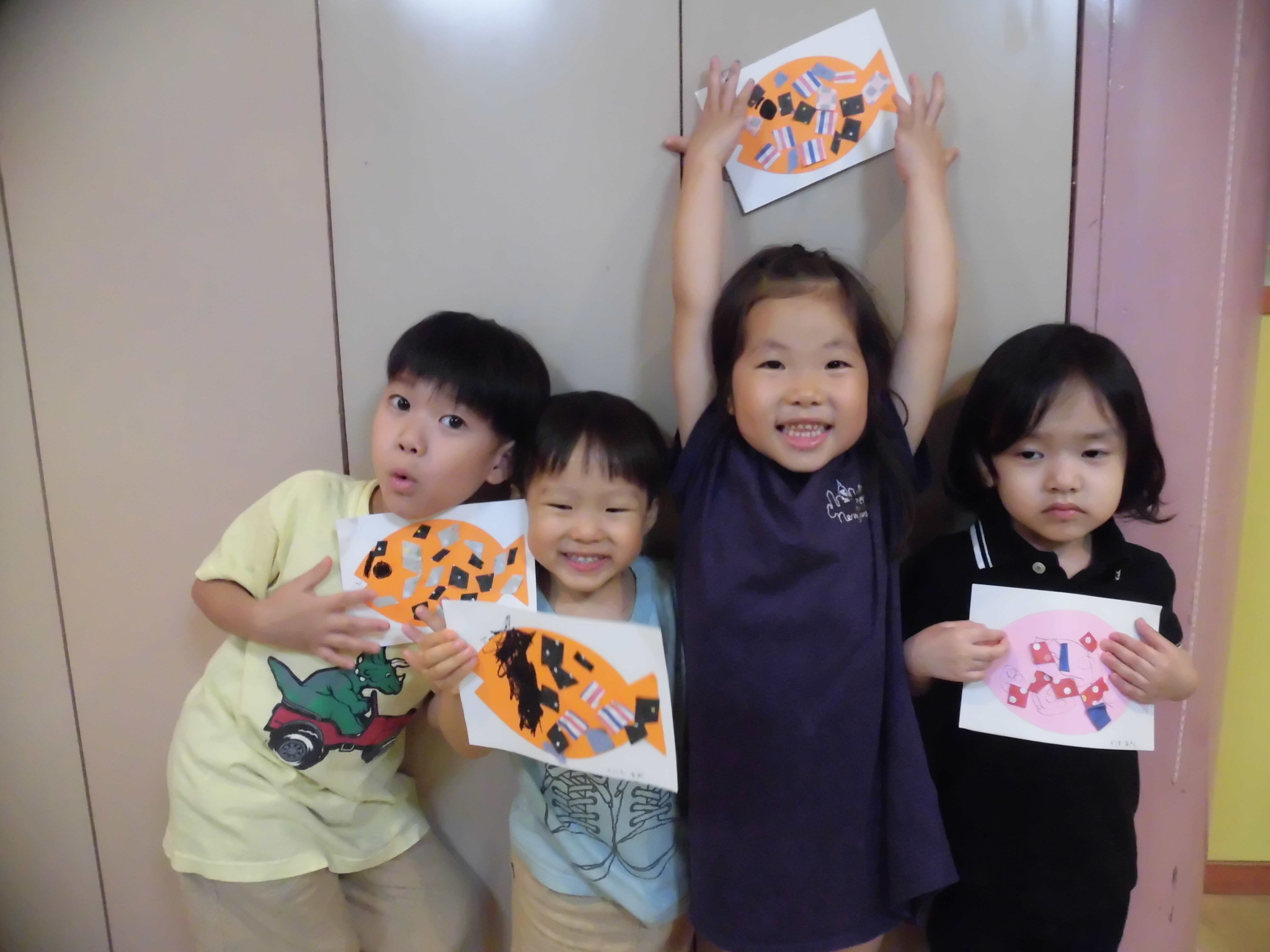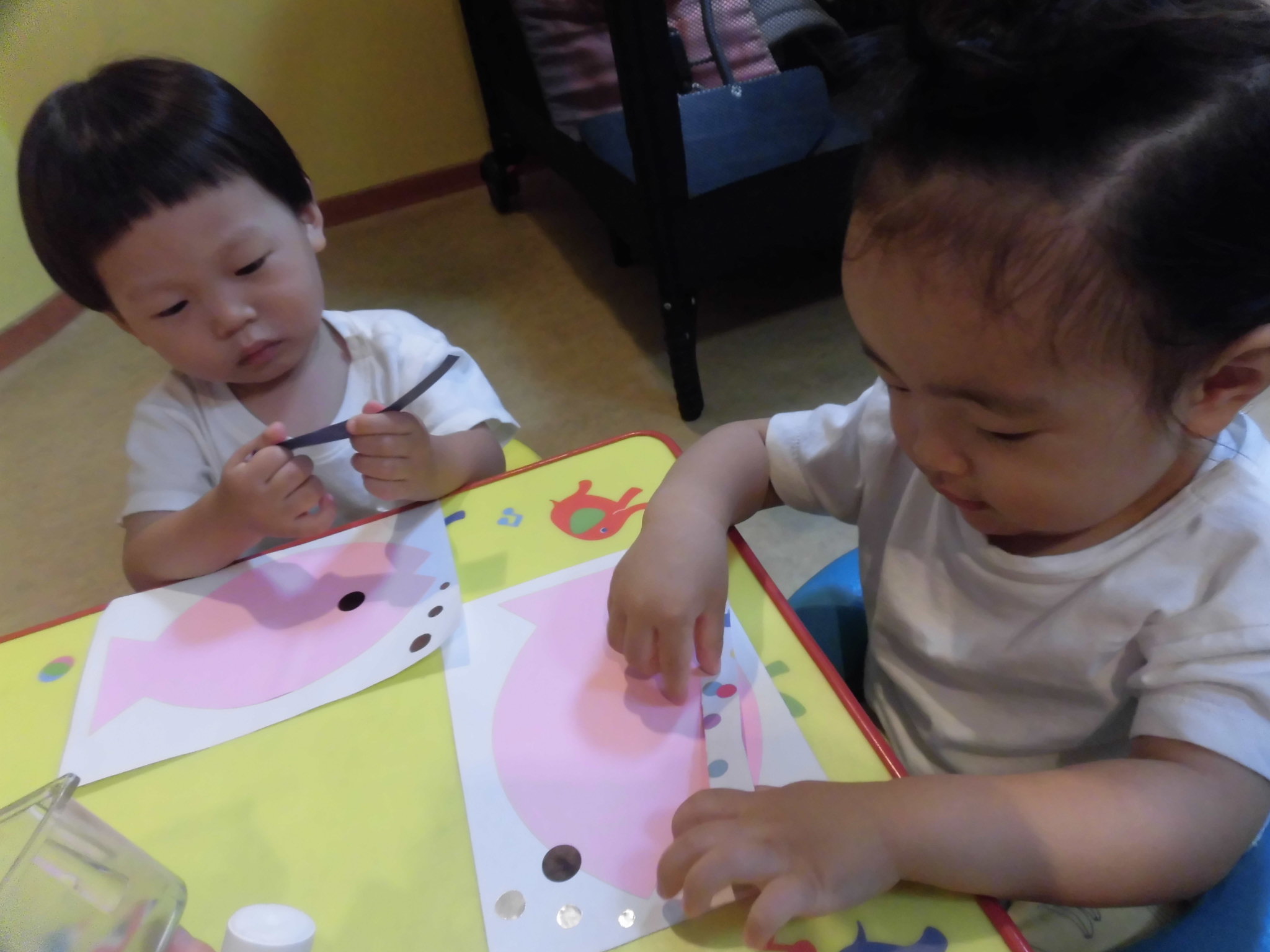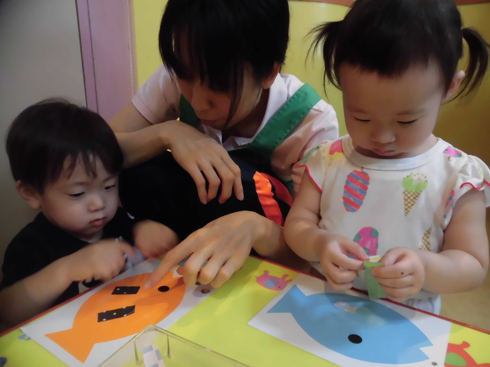 小さい子は、折り紙をちぎってお魚の台紙に鱗のように貼りつけていきました!