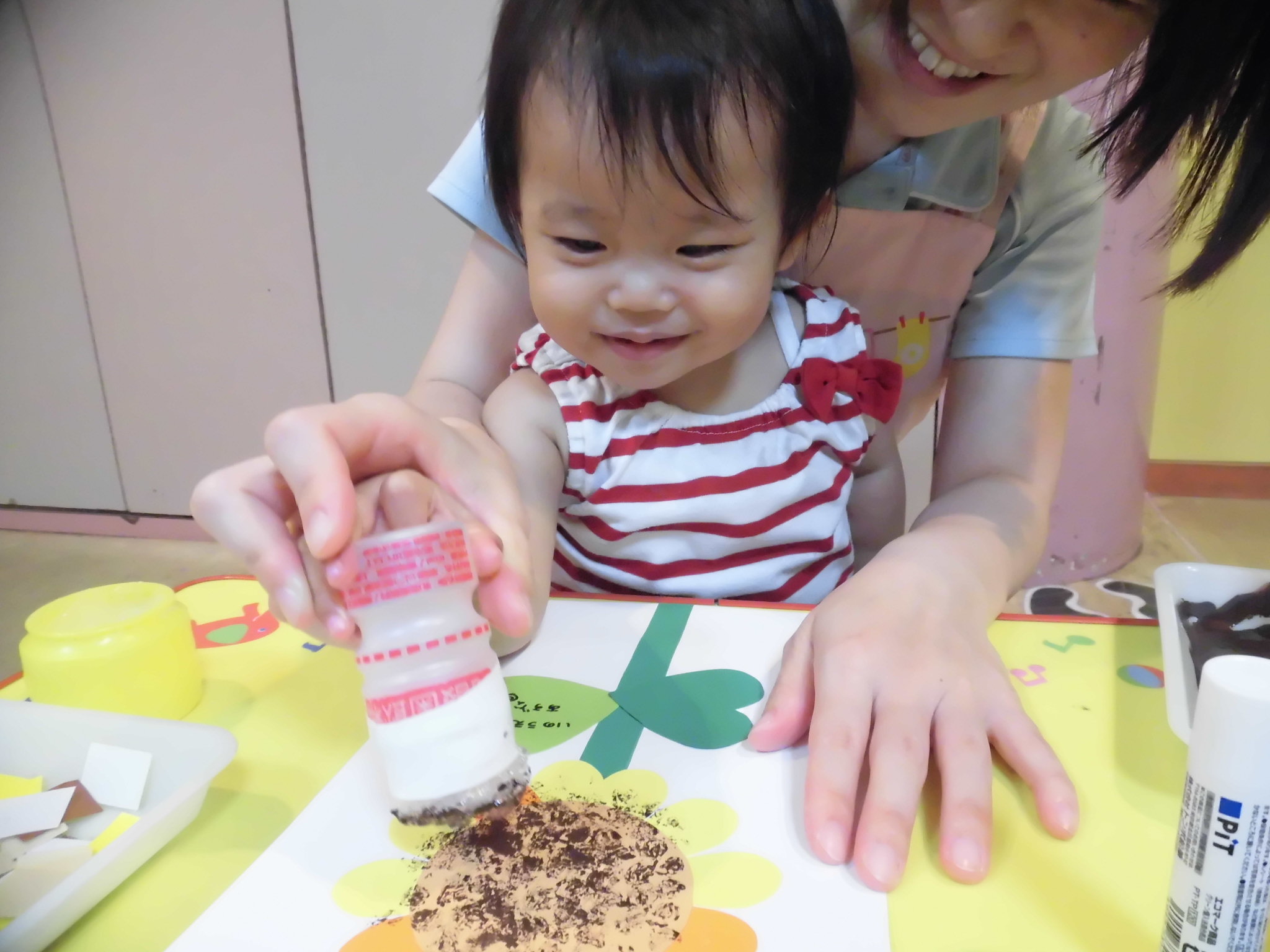 手にスタンプをおしたり、のりのくっつく感触を手をグーパーしながら楽しんでいましたよ⭐
