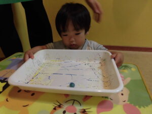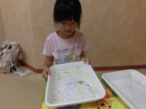 どの年齢もビー玉を転がして、絵の具で模様を付けましたよ♪