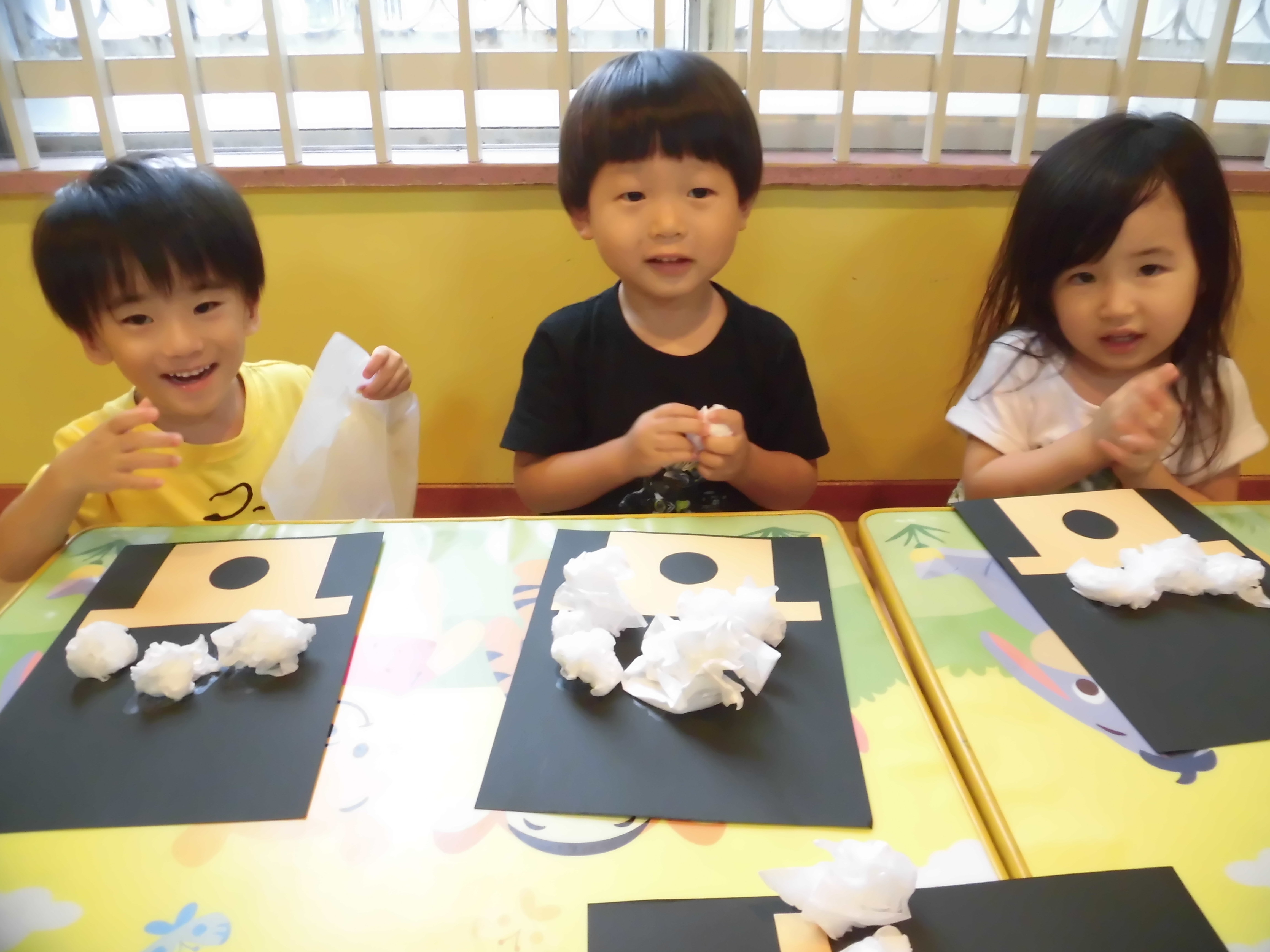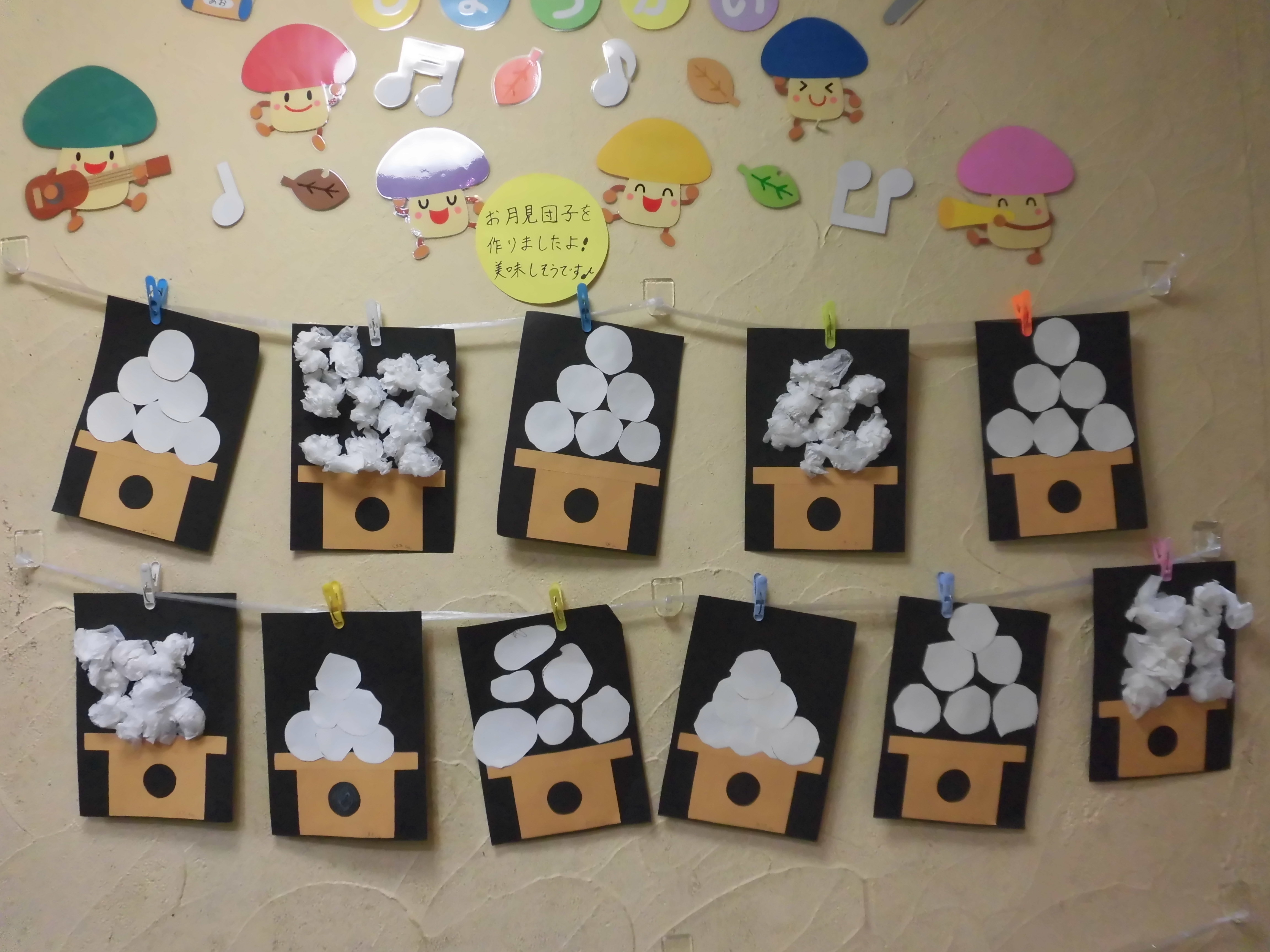 みんな、見本を見ながら台の上に山型に貼っていき、美味しそうなお月見団子を作ることが出来ましたよ?