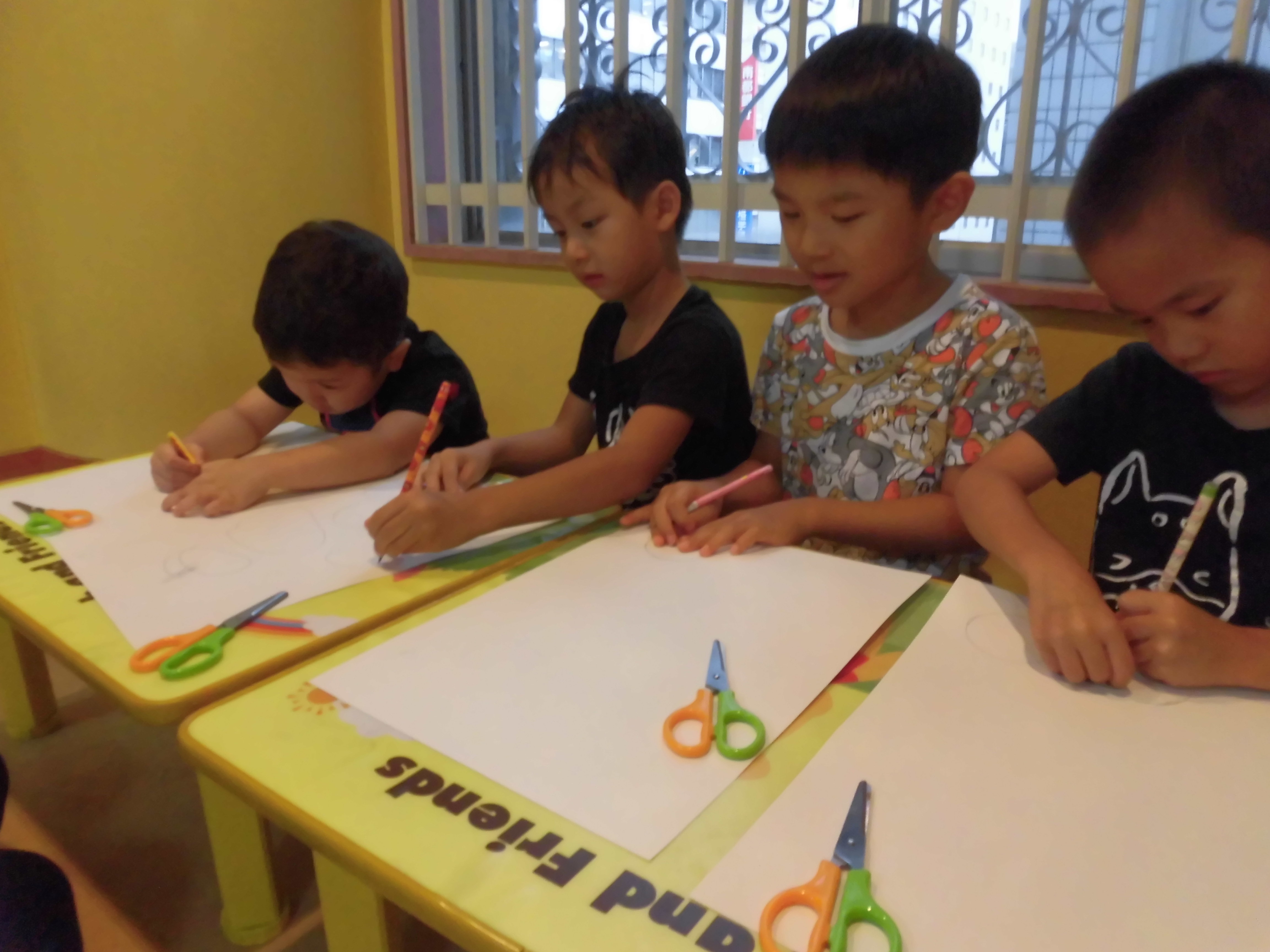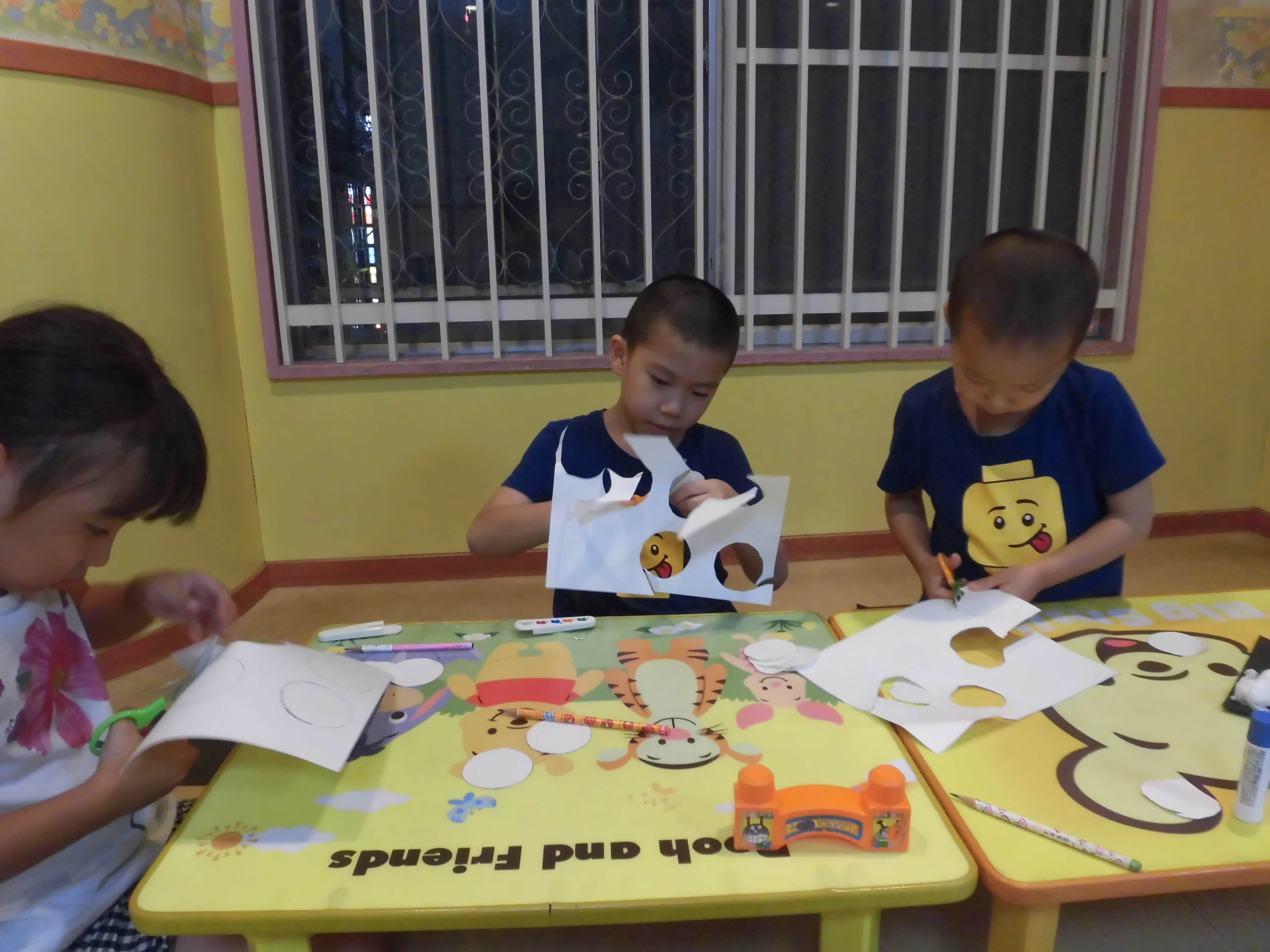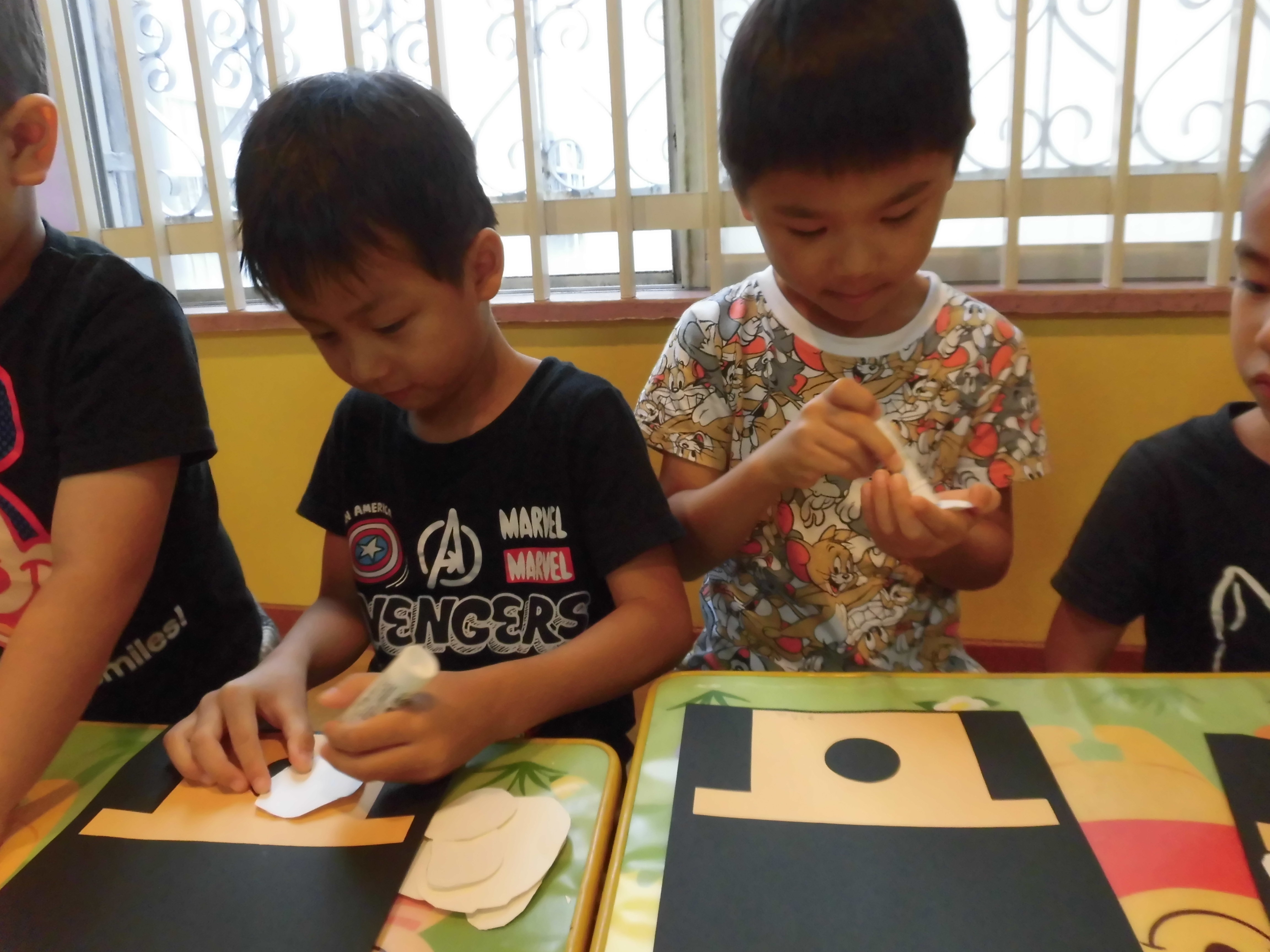 大きい子は画用紙で型取りしてハサミで切り、上手に丸いお団子にできました!