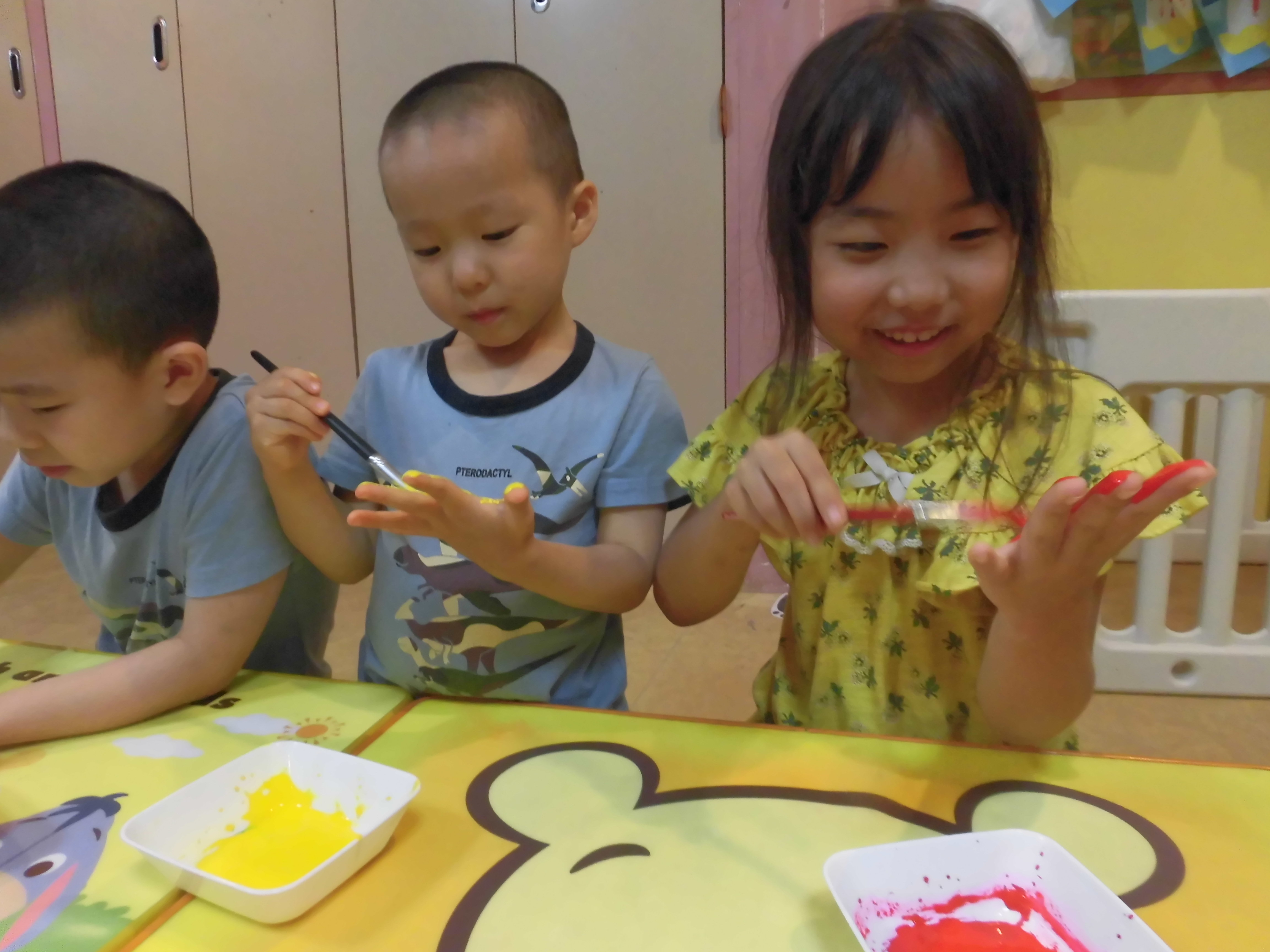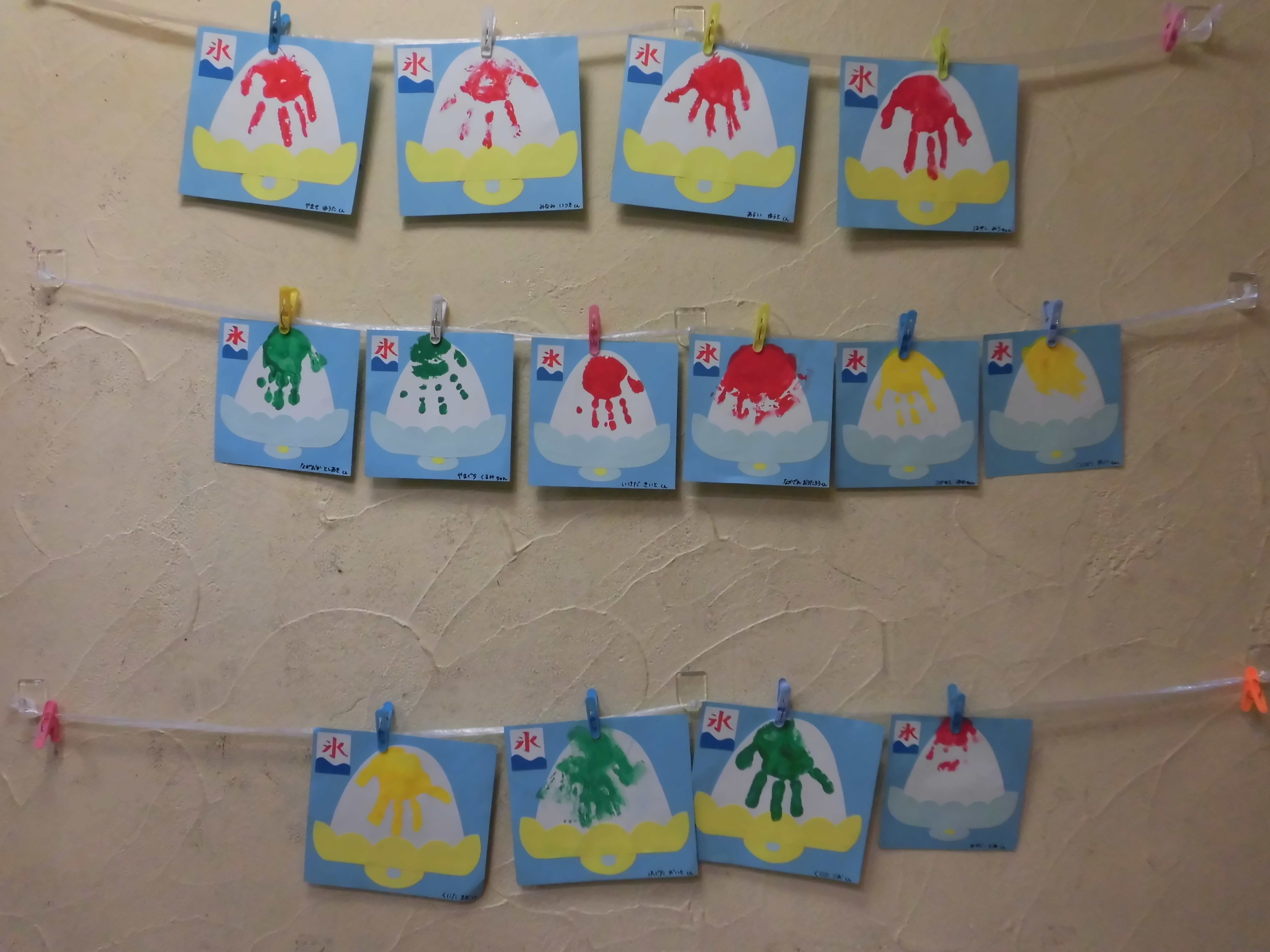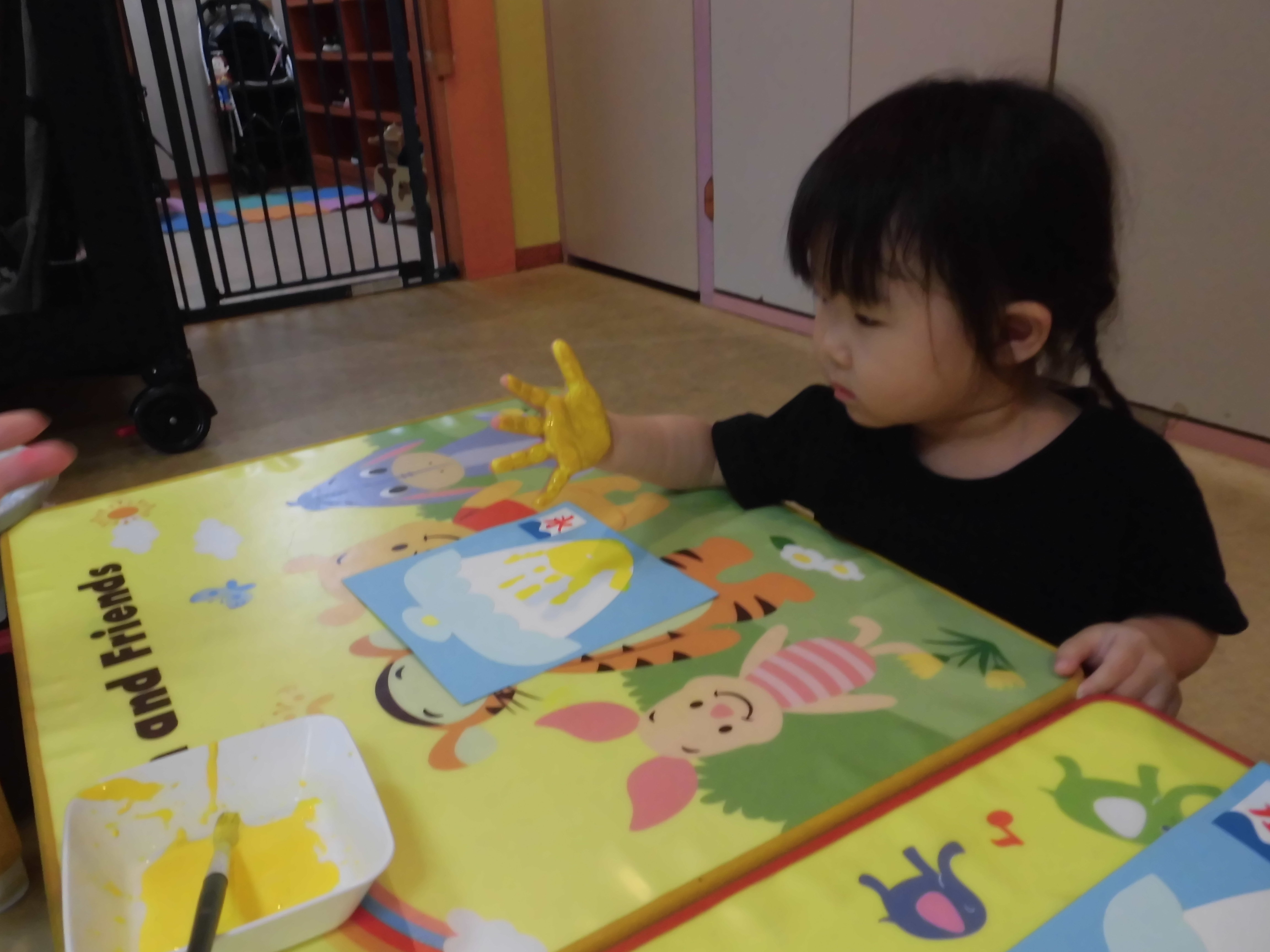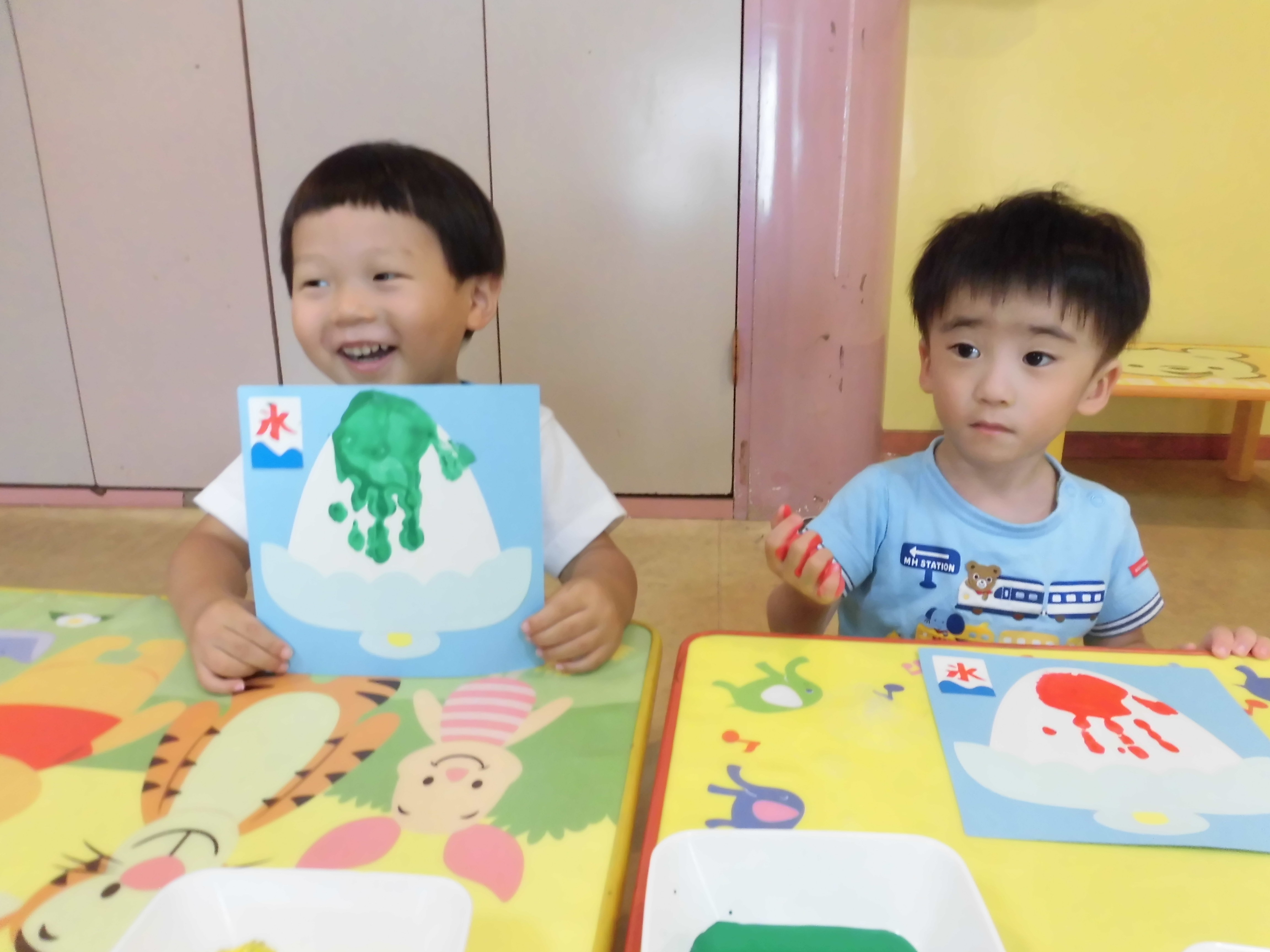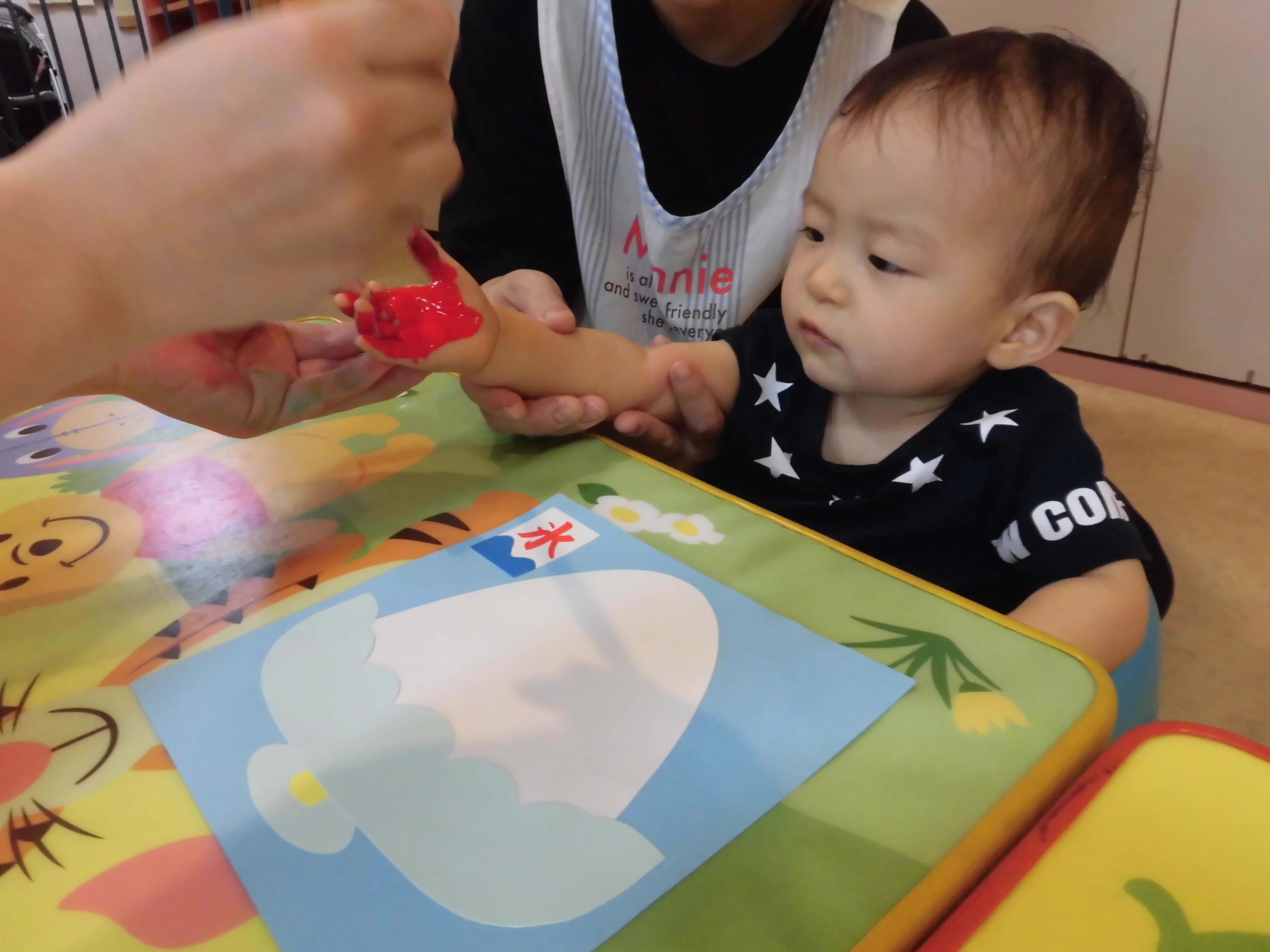 小さい子の手は先生が絵の具を塗ってあげると、不思議そうに見つめる子や、泣いちゃう子、「色が変わったね〜!」と嬉しそうにする子など様々な反応がありました?