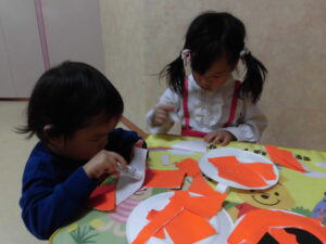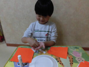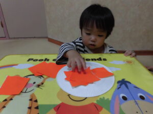 紙皿に折り紙をちぎって貼ってかぼちゃ色にしていきます。