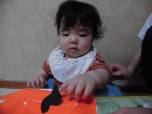 かぼちゃ色に出来たら、最後に目と口を貼っていきます。
