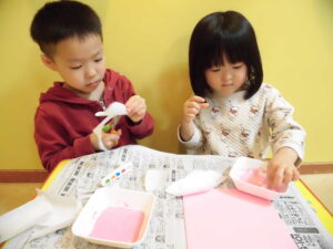 いざ作り始めると保育士が説明中に言っていた「ぺったん🎵ぺったん🎵」という効果音を真似して「ぺったん🎵ぺったん🎵」とノリノリでスタンを押して作っていました✨