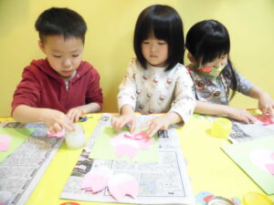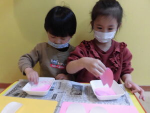 たくさんの花を握りしめて両面テープの上に置いてみたり、1枚ずつ綺麗に並べたりして一生懸命作っていましたよ😚