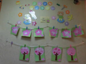 両面テープが貼られた画用紙に画用紙で作った桜の花を上から降らせて桜の木を作りました。