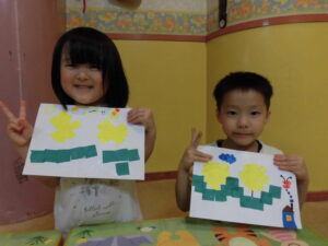 大きいグループさんは、お花と葉っぱを切って貼ってもらいました。