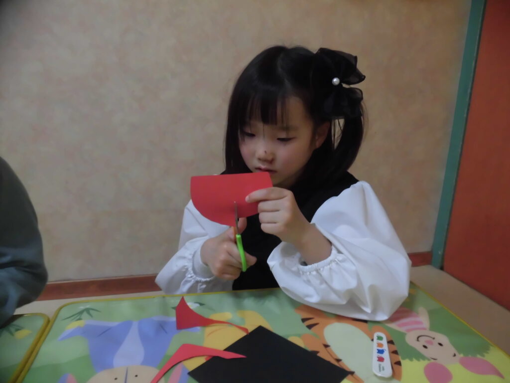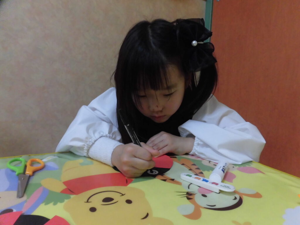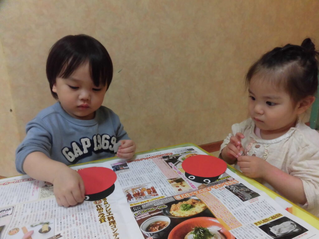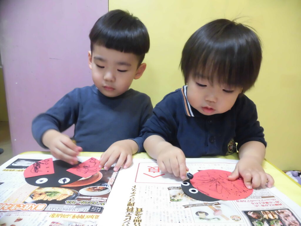 大きい子達はハサミでテントウムシの形を切って、ペンで模様や顔を描きました!