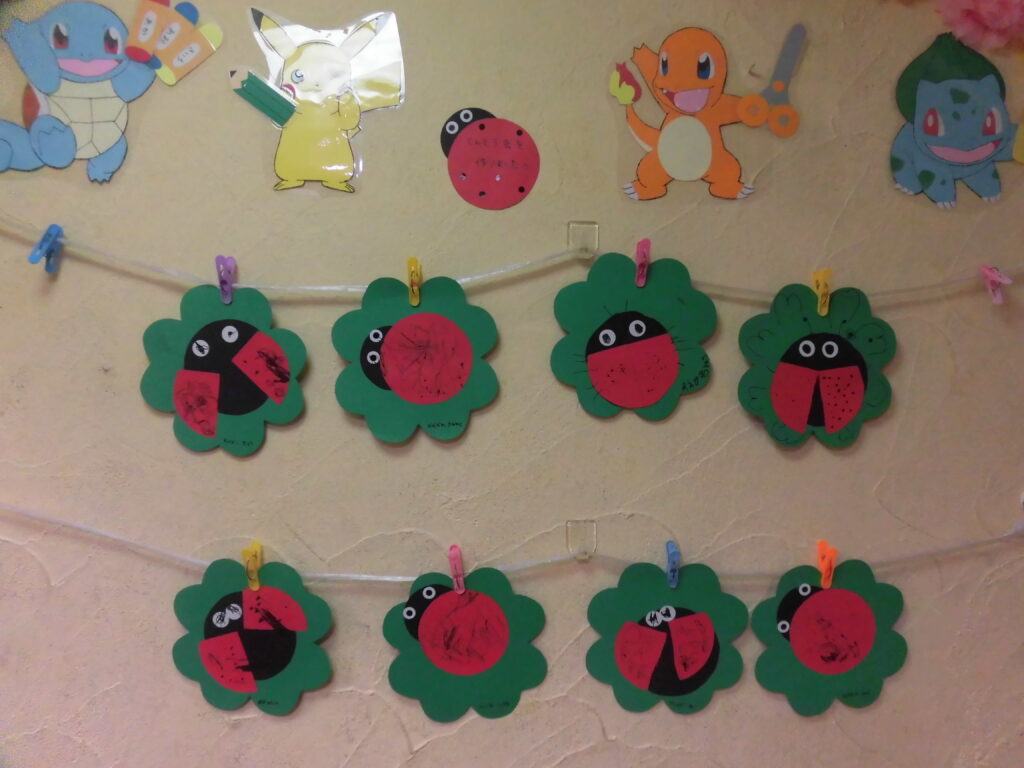 小さい子達はクレヨンでテントウムシの模様を描きました!