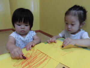 1〜3才の子は画用紙に赤色のクレヨンやマーカーで色をつけました!ぬりぬりと満足するまで塗りましたよ♡