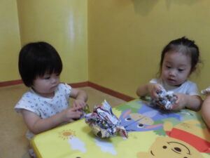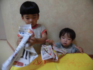 次に広告をくしゃくしゃっと小さく丸める作業☺︎広告の音や感触に楽しんでいる様子でした✳︎
