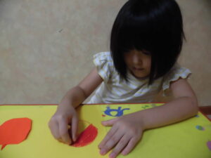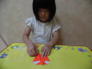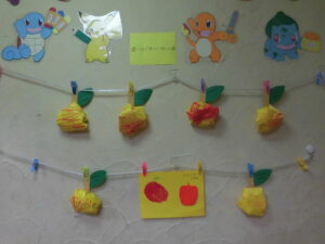 大きい子は折り紙でりんごを折り、クレヨンで絵を描きました!先生が教えながら一緒にやったので形の綺麗なりんごが完成しました!✨