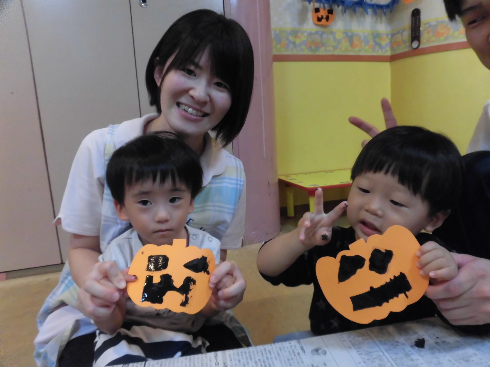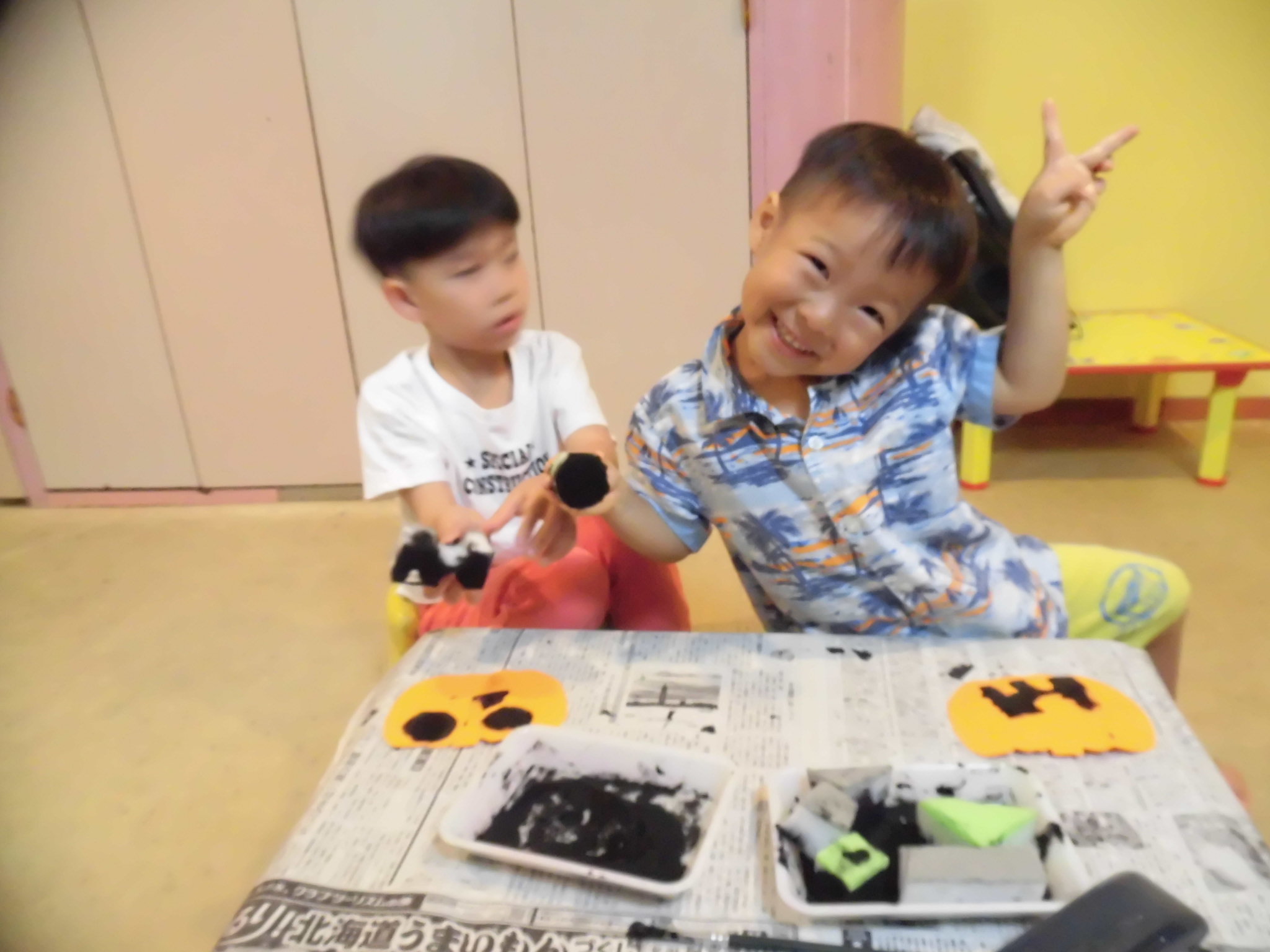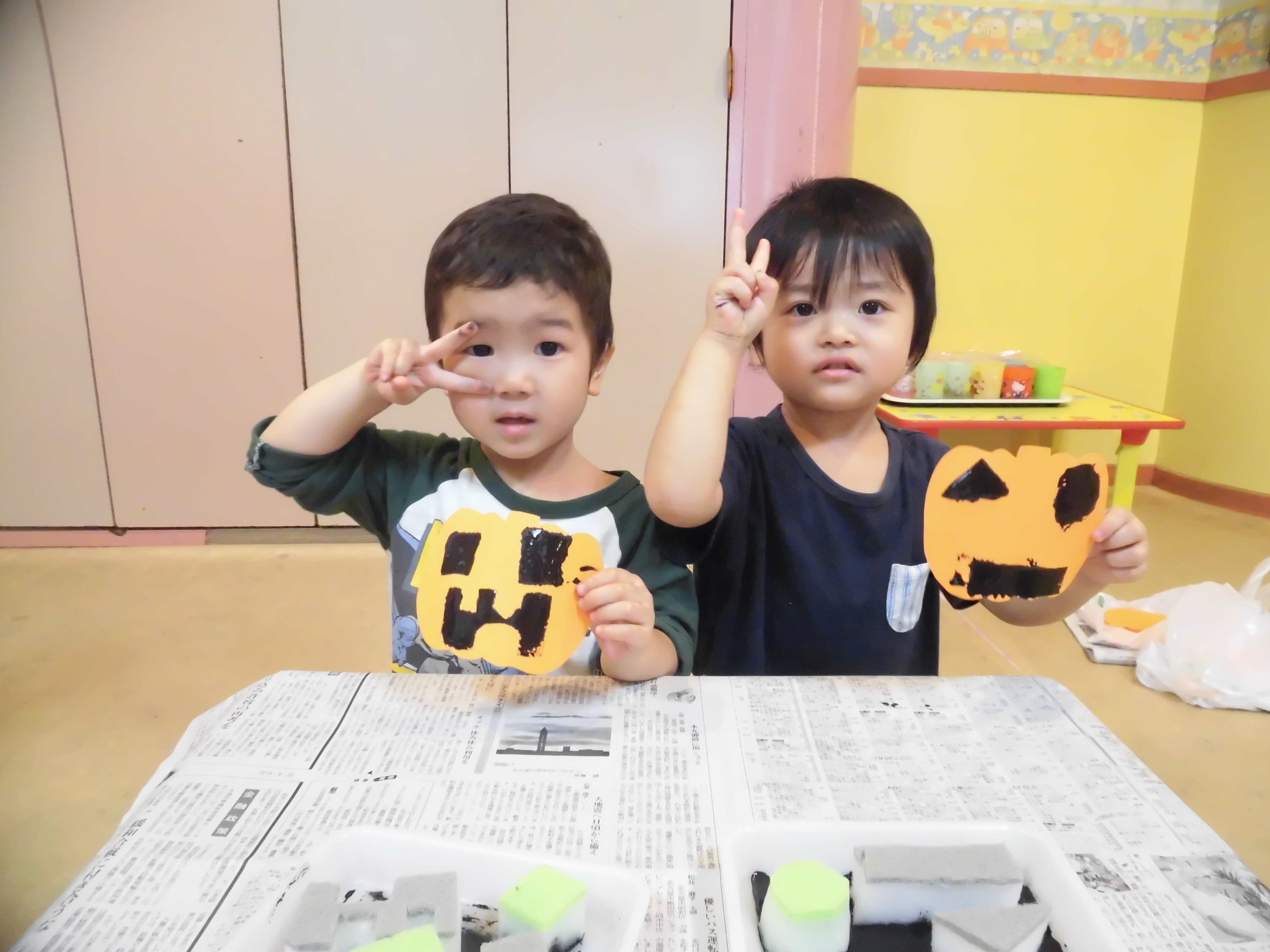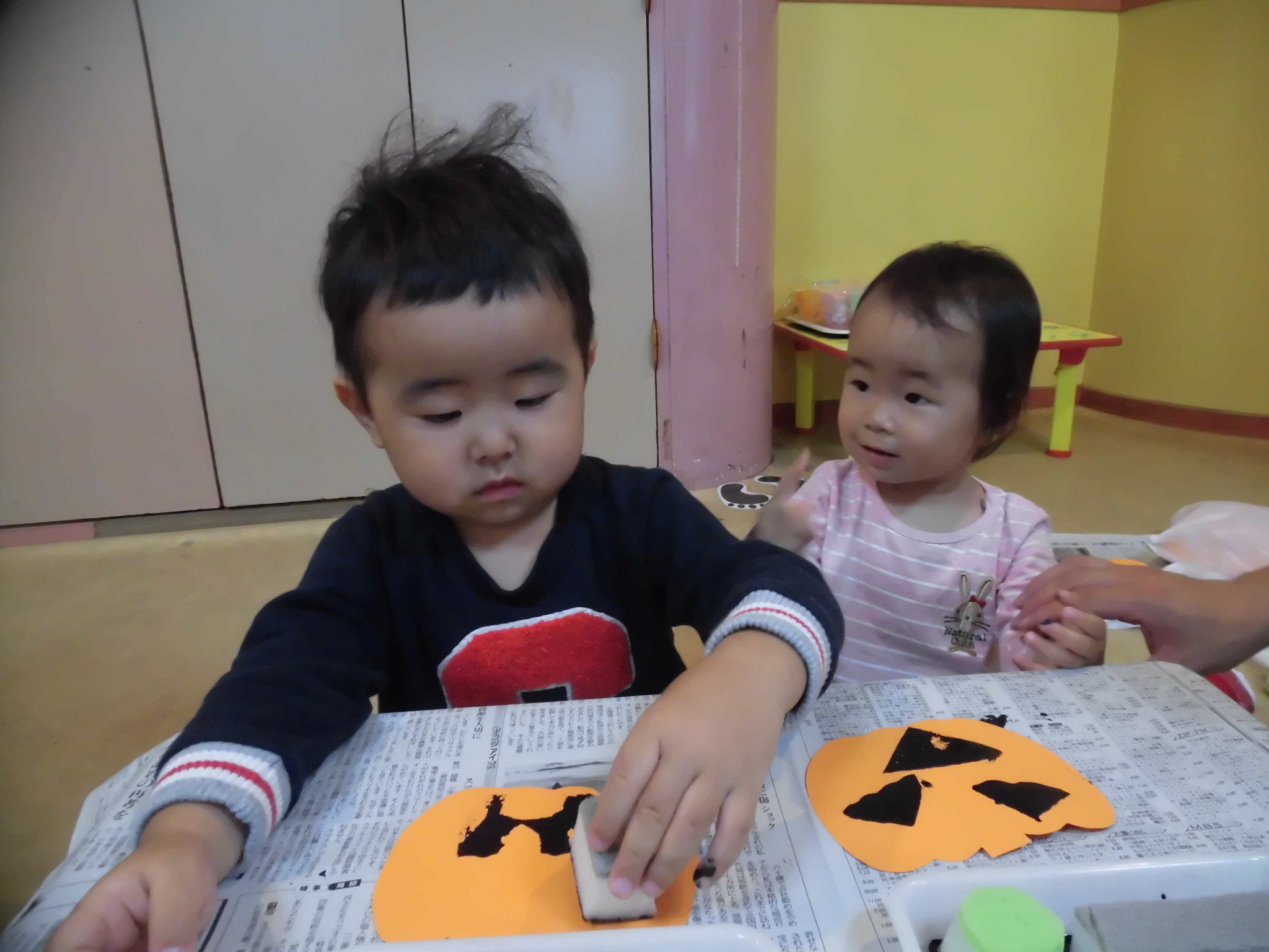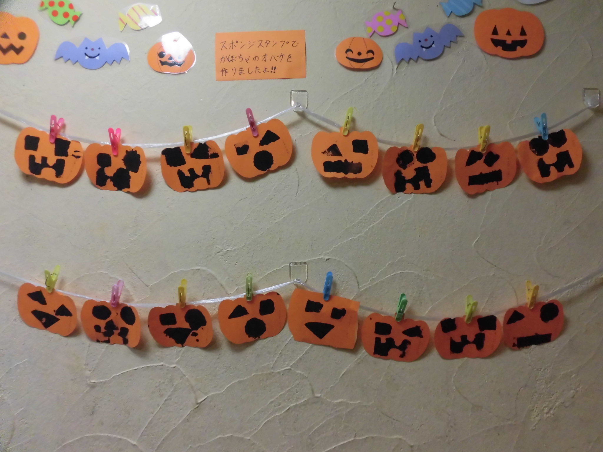 カボチャの形の画用紙にスポンジを使ってスタンプで顔を作りましたよ。