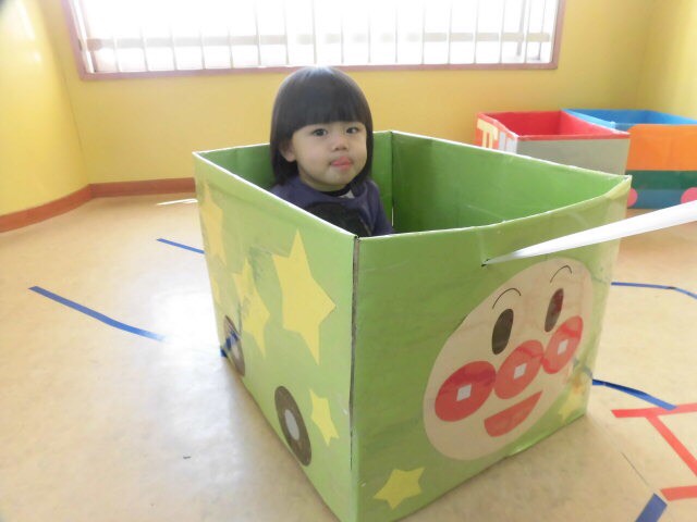 小さいお友達は、アンパンマンの車に乗りました!車の中へ入るとハンドルを持ったままニコニコ座っていたり、