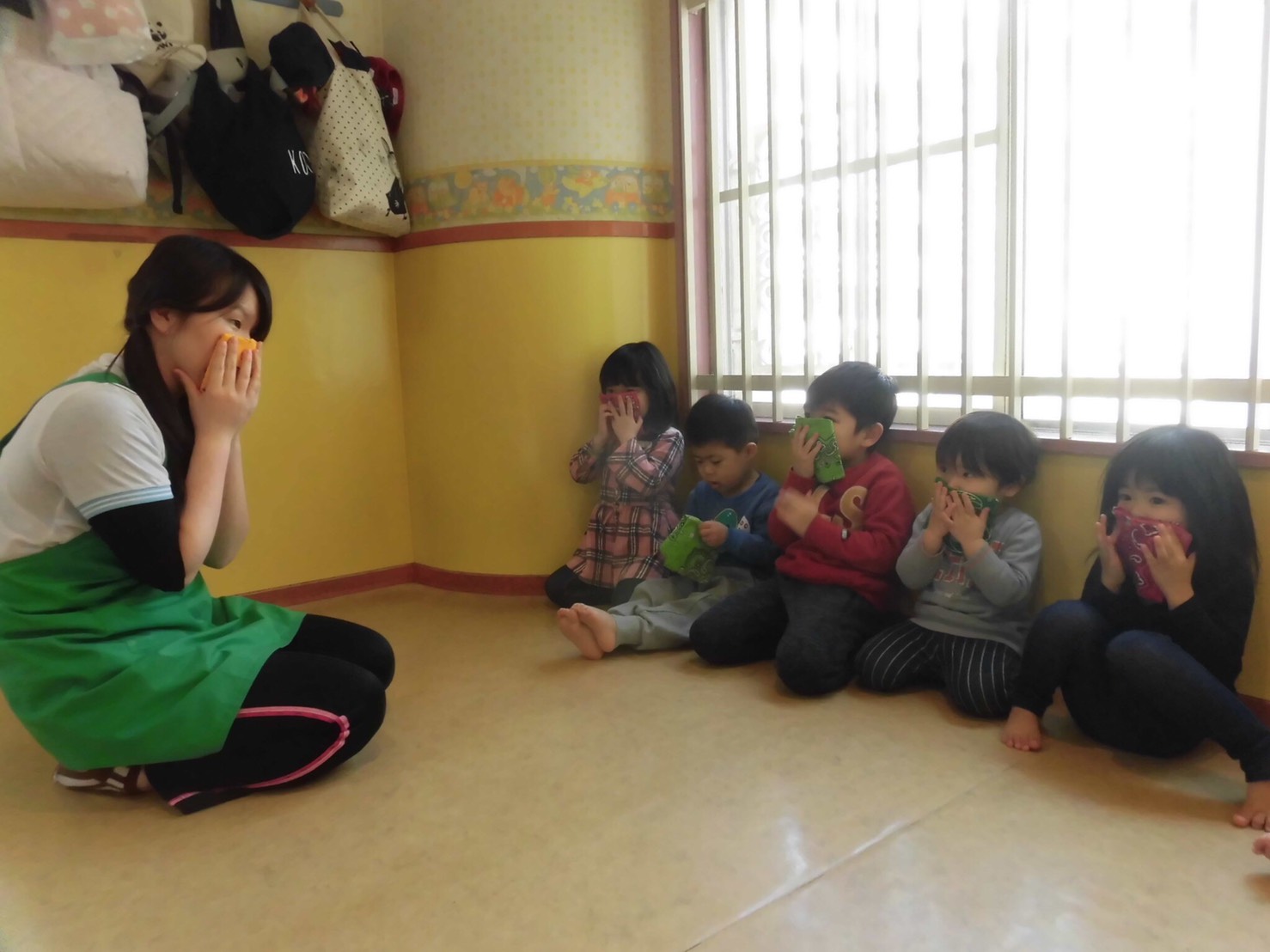 避難訓練をすることを伝えた後にハンカチを渡すと直ぐに鼻と口を塞いで見せてくれた子ども達。