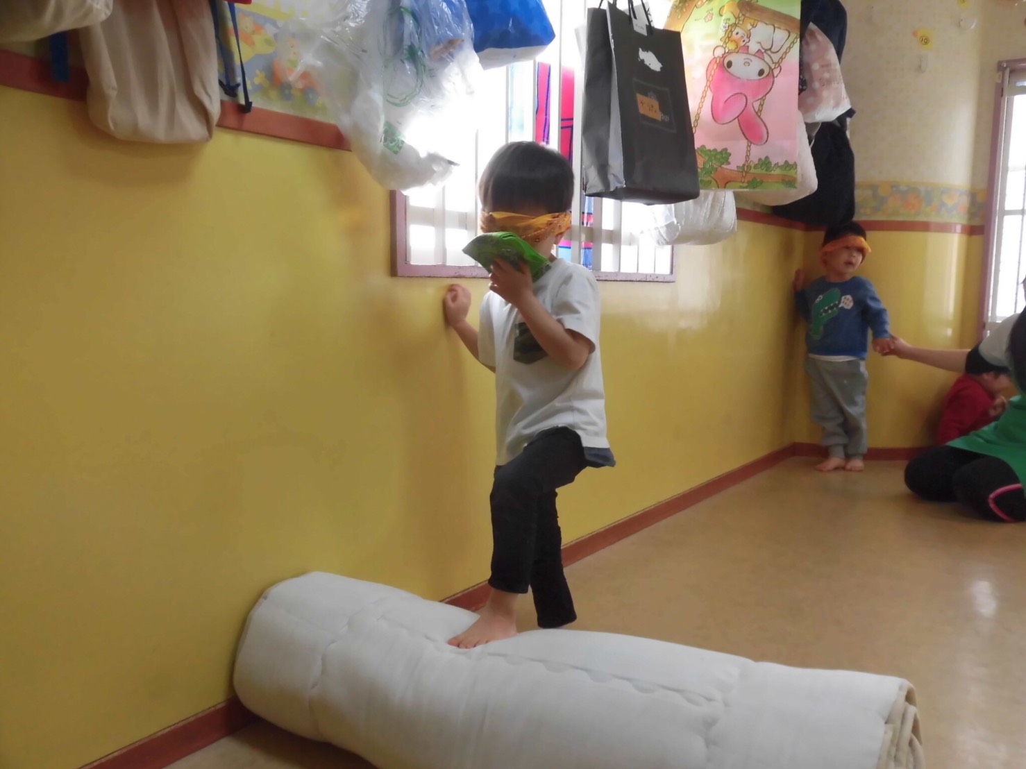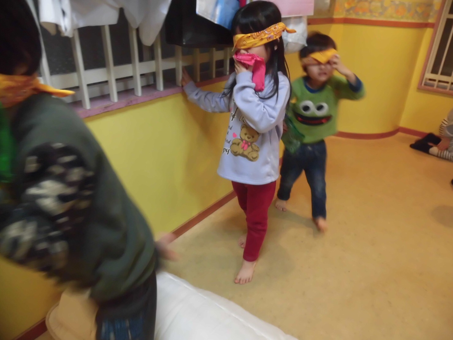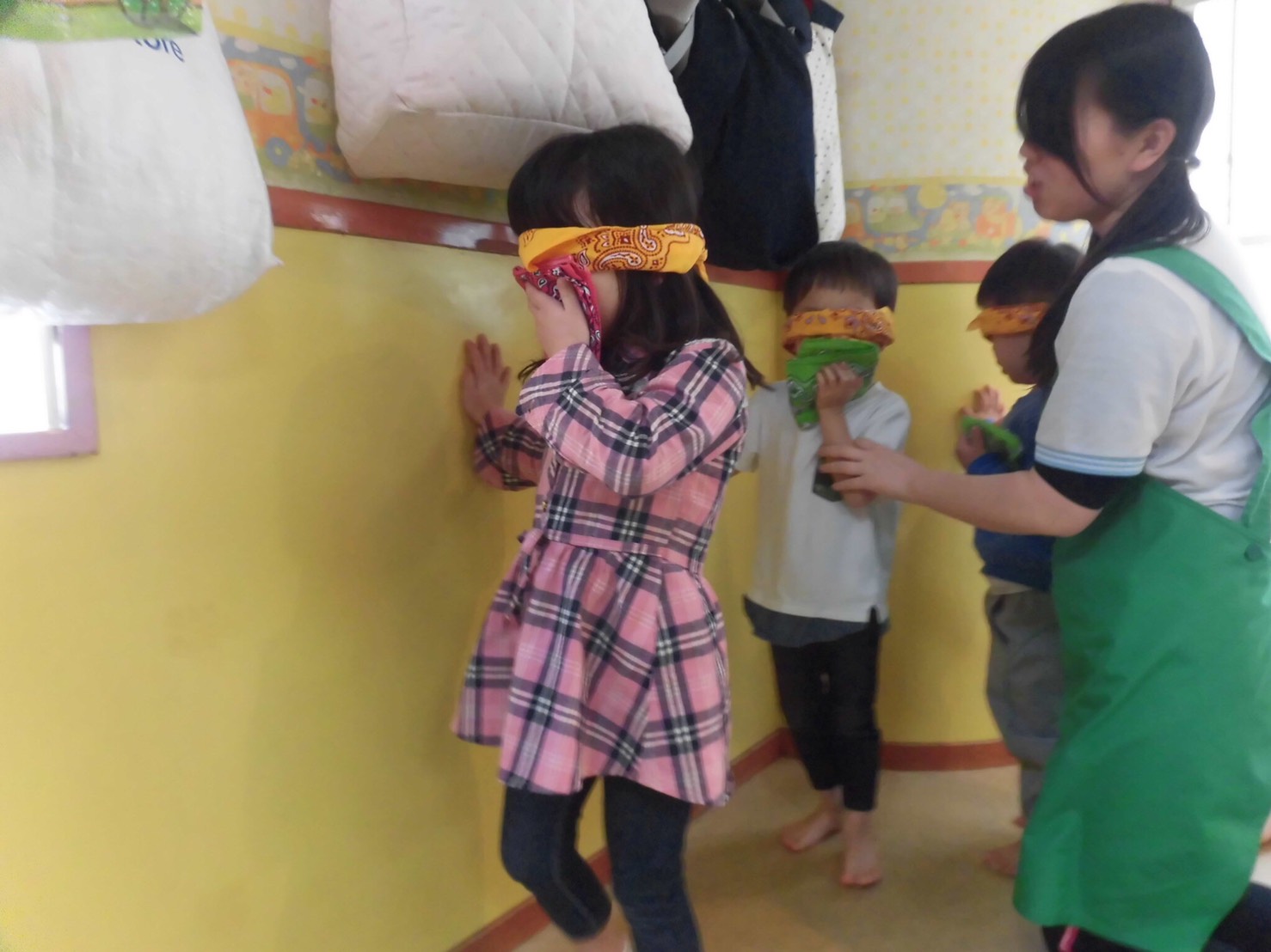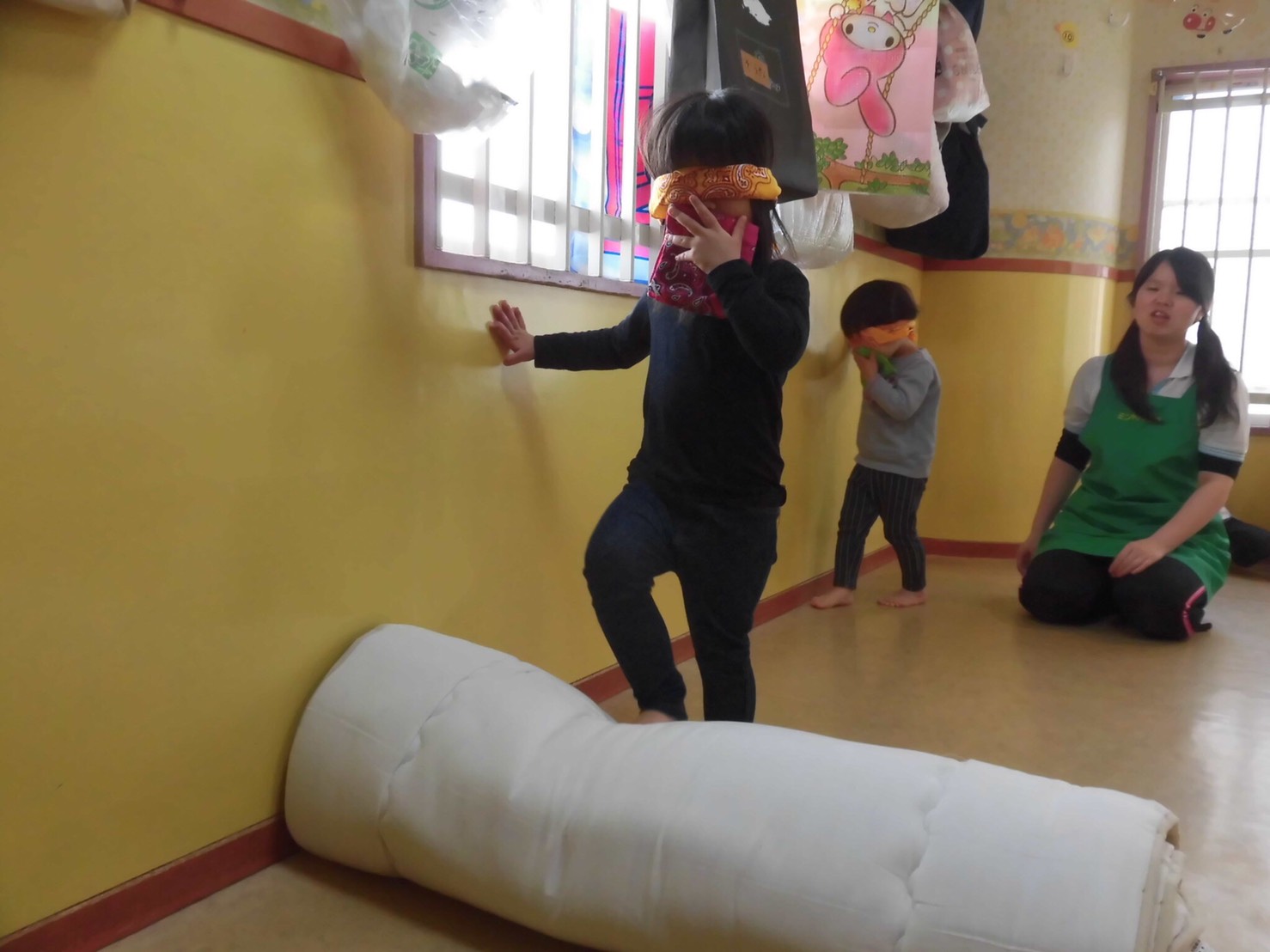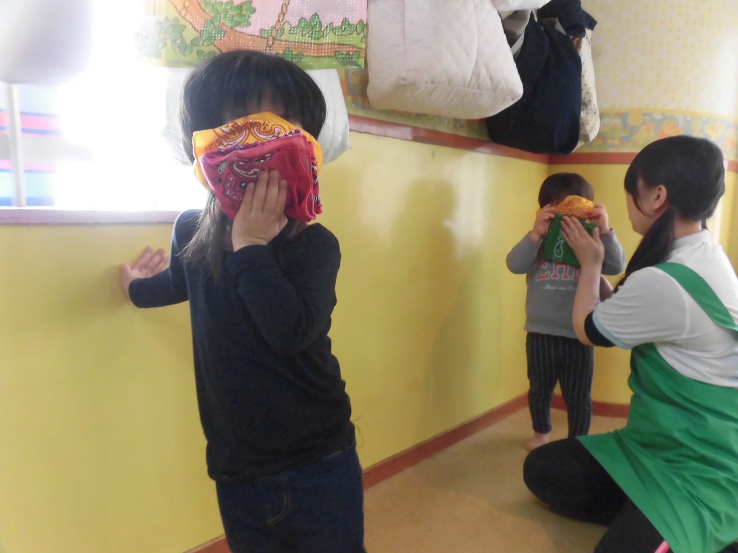 覚体験として煙の代わりにバンダナで目隠しをしてお部屋の壁づたいに歩く練習をしました。