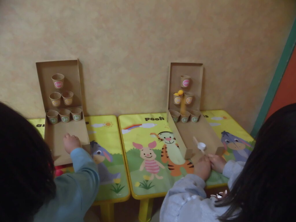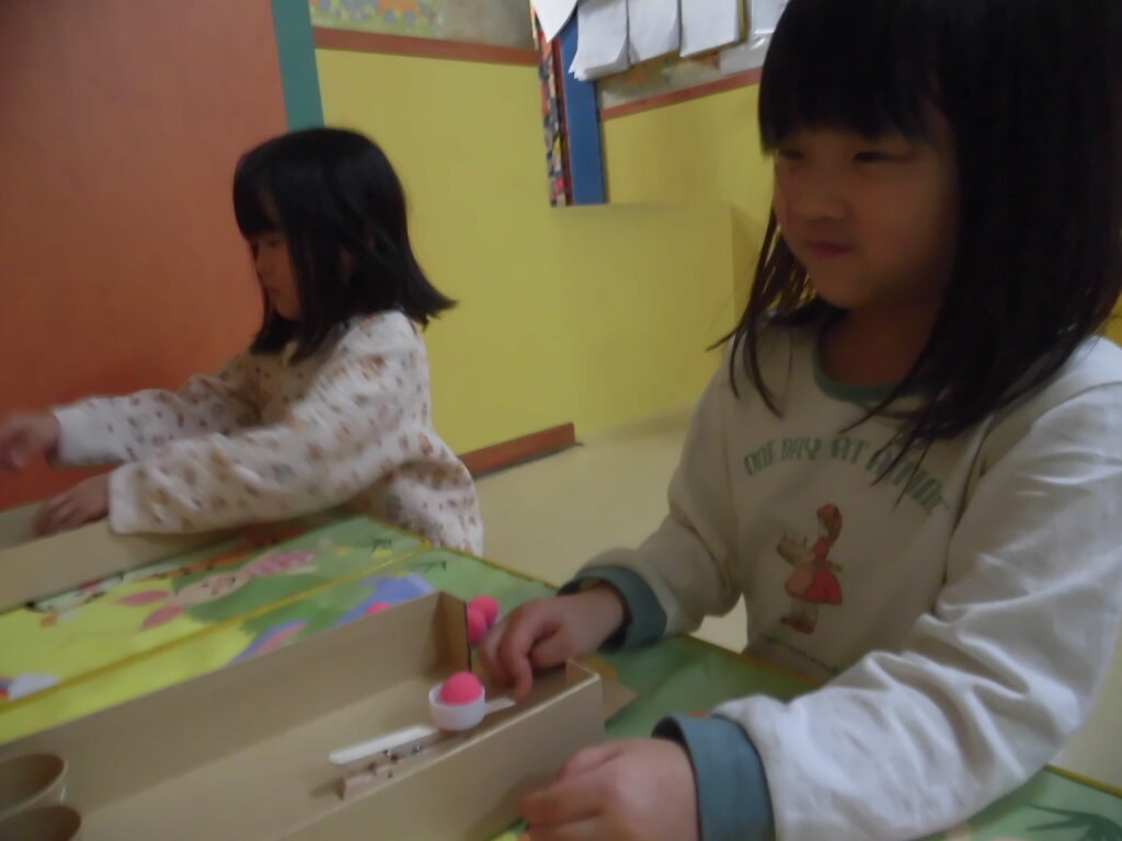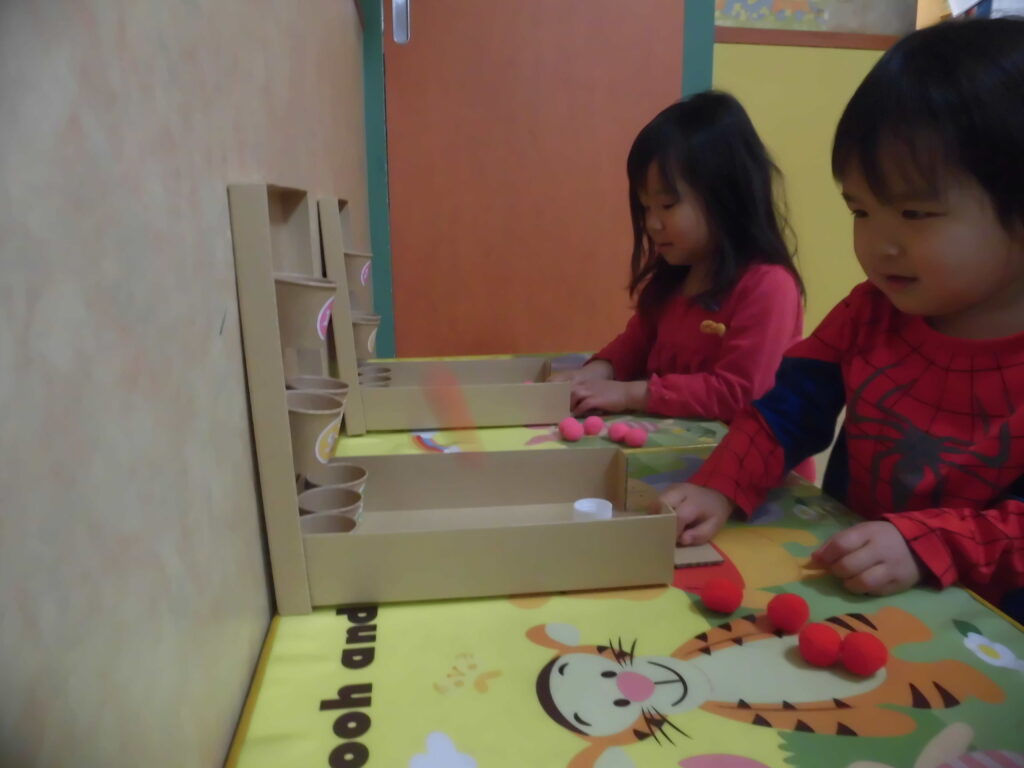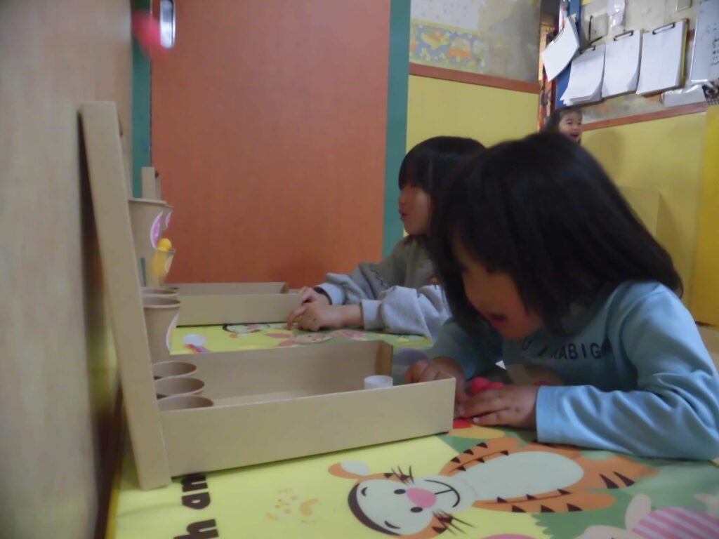 遊ぶ見本をみるとすぐにボール落としだと気づいた子ども達。