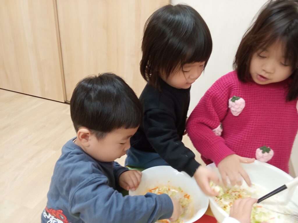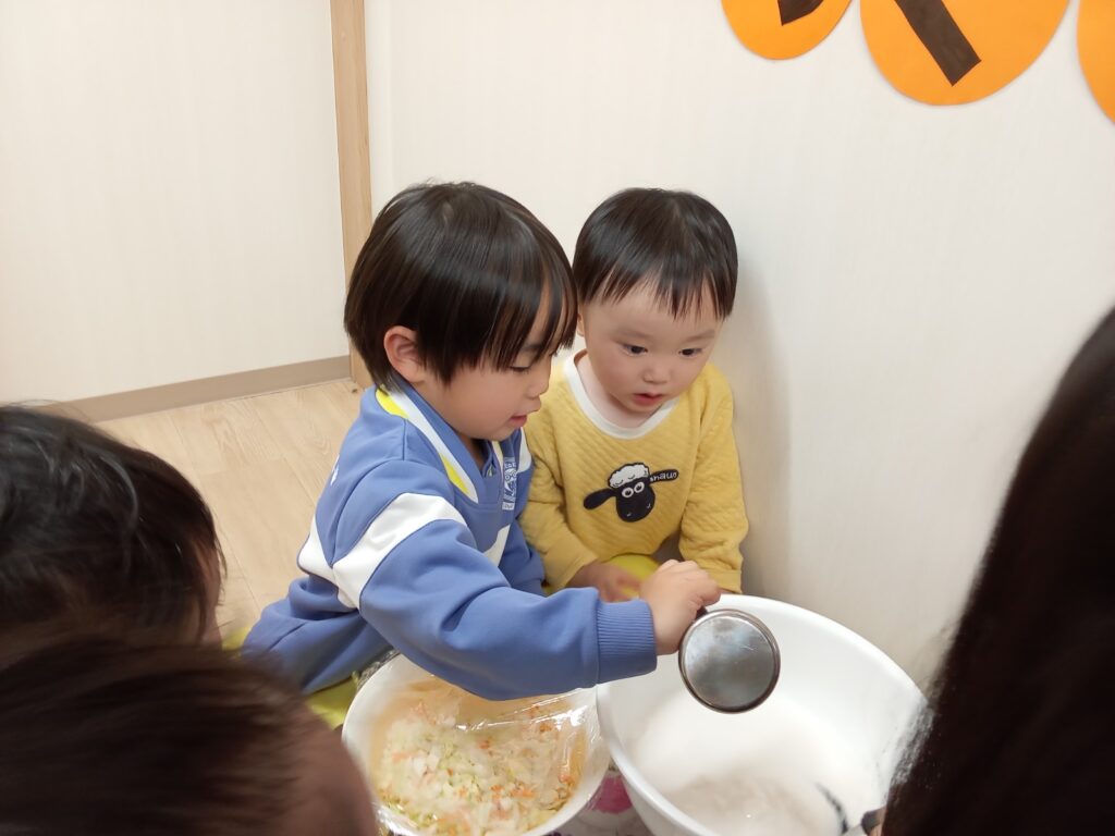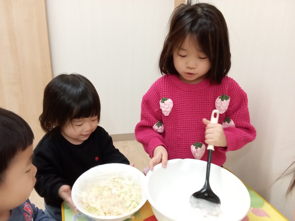 キャベツと人参と米粉とだし汁の材料で作りました。まずは具材をボールに入れて、みんなで協力して混ぜ混ぜ😁
