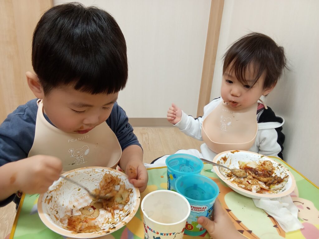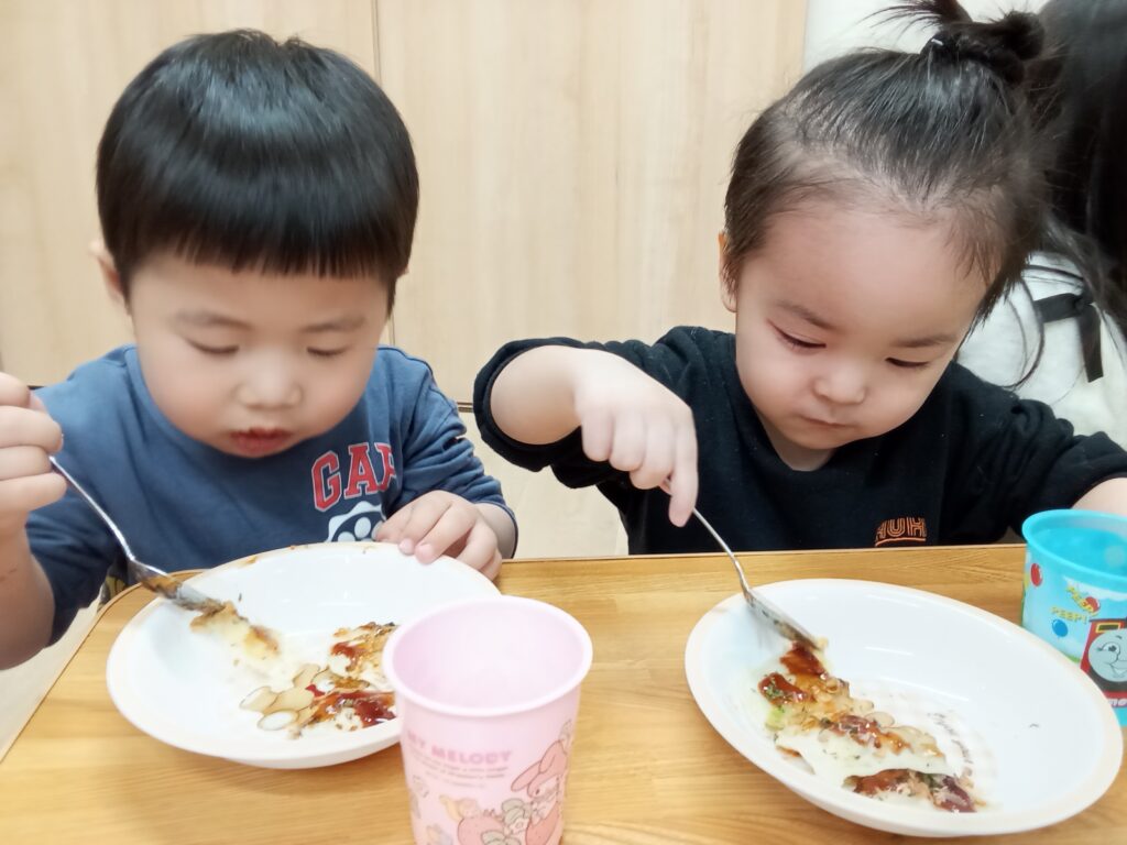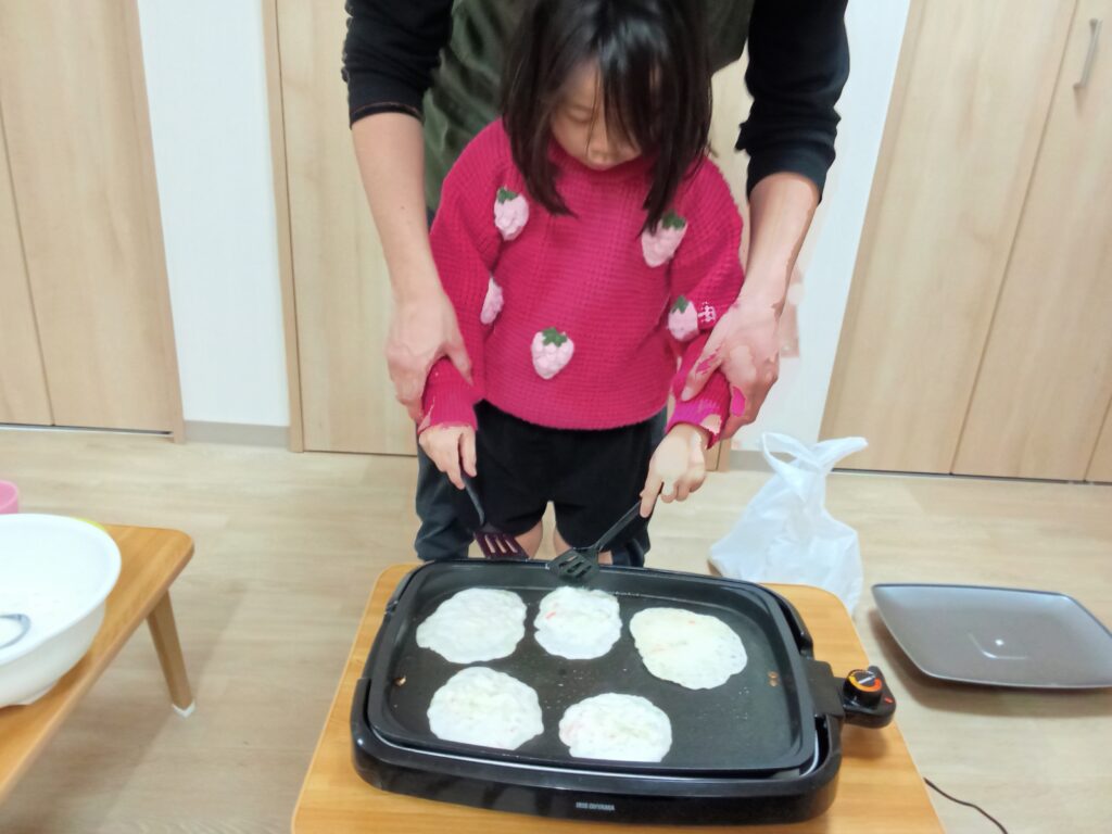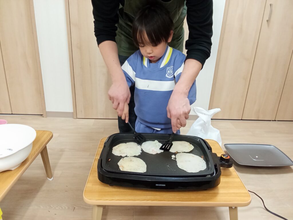 ジューという音や湯気などで、「ワァー」と子ども達のテンションが上がっていきました✨