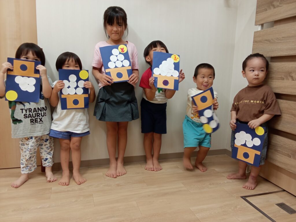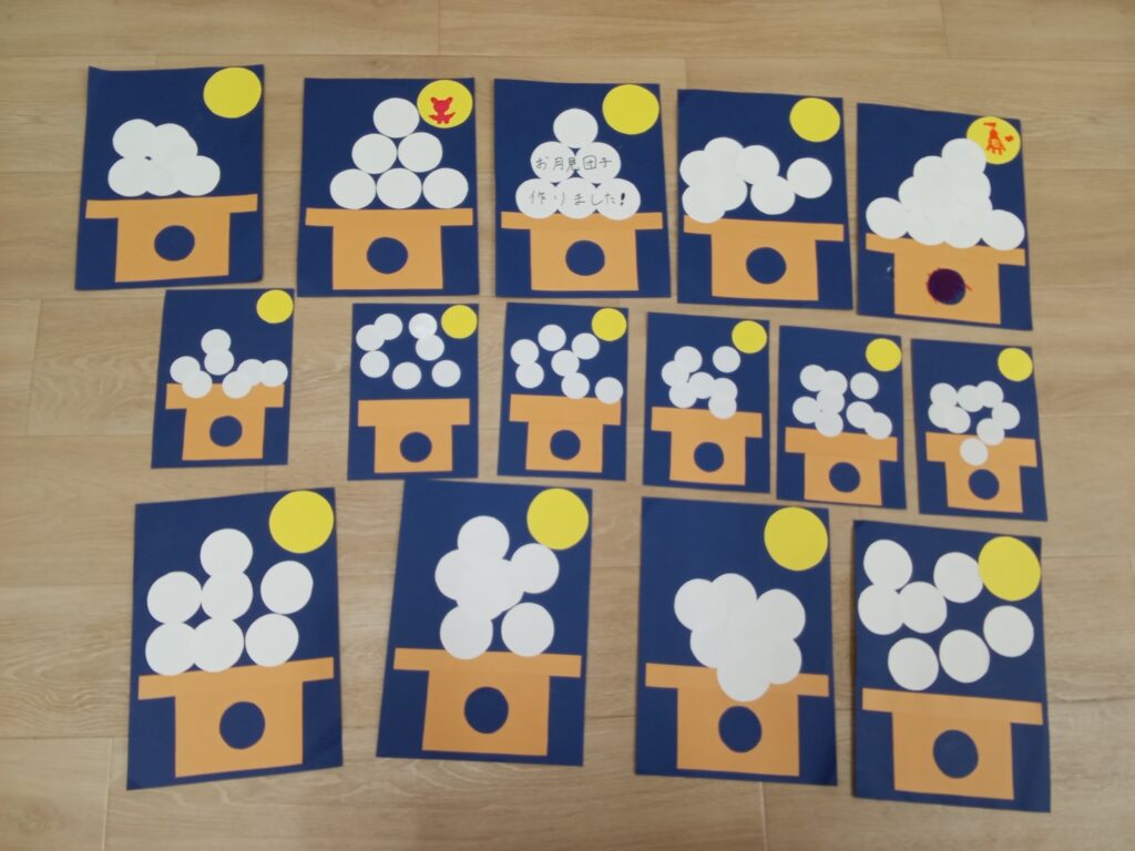 大きい子達は、画用紙で作ったお団子を糊で貼りました!