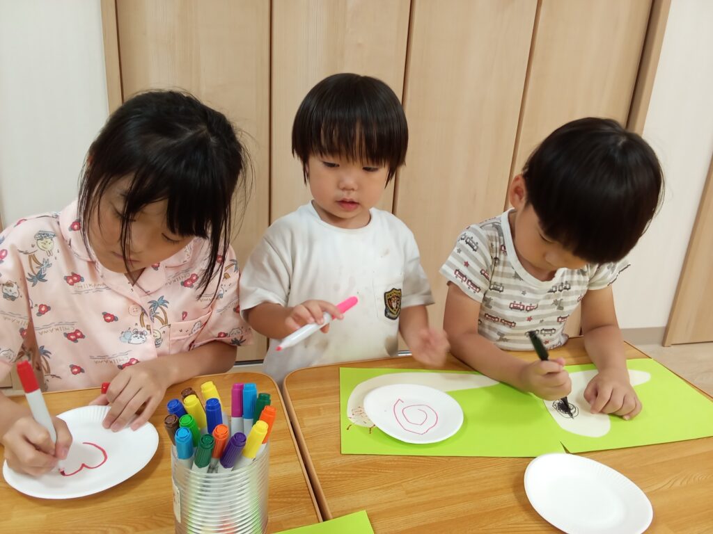 まずはペンで目と口とツノを描きました。小さい子達が自由にペンを動かして色々な表情が生まれていて面白かったです😚(笑)