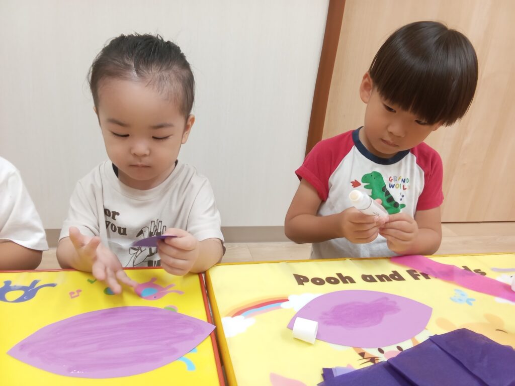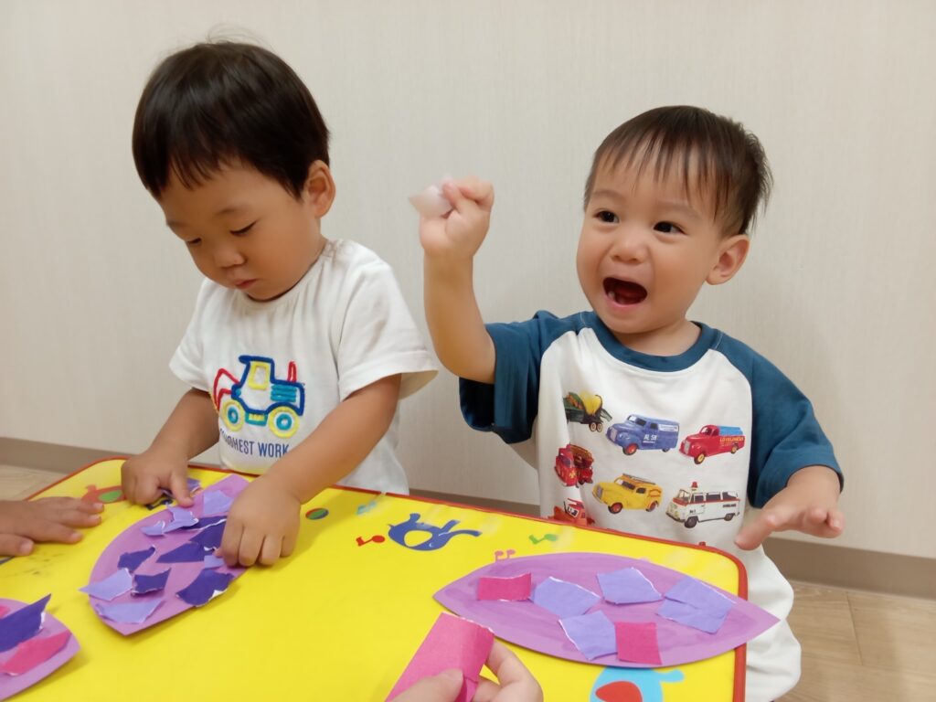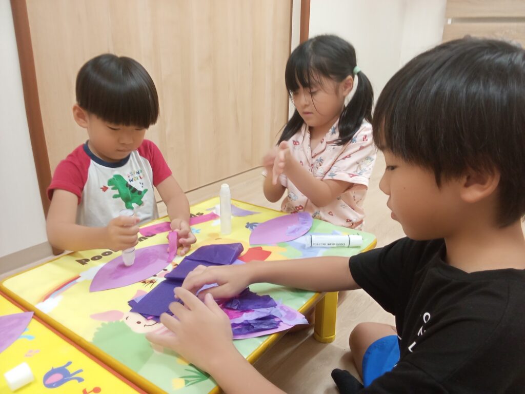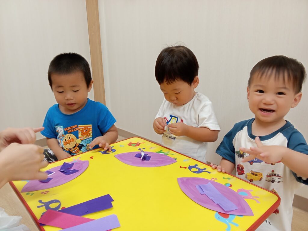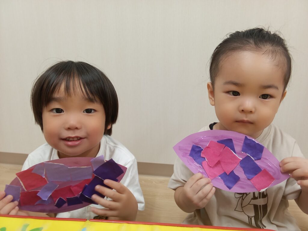 小さい子達は折り紙を破って、さつまいもの形をした画用紙に貼り付けていきました✨