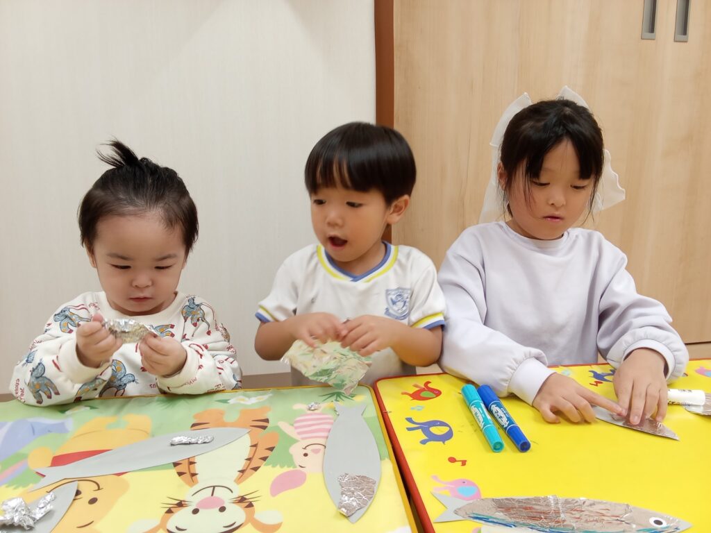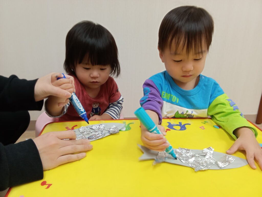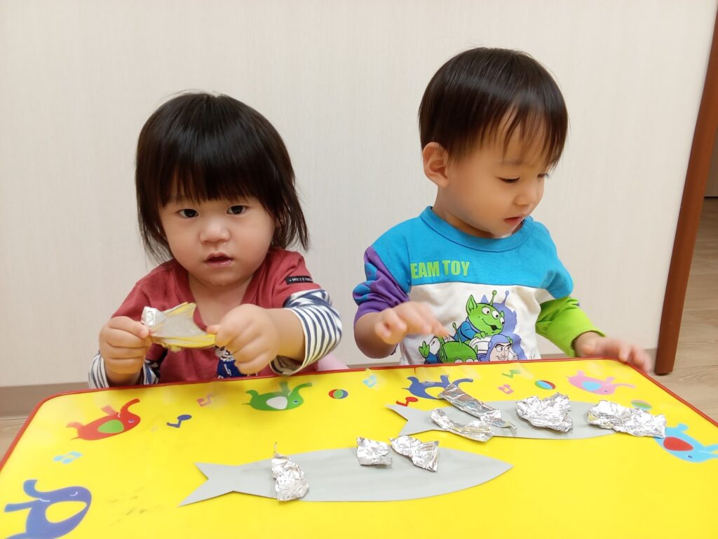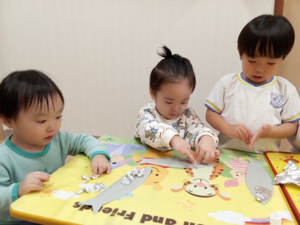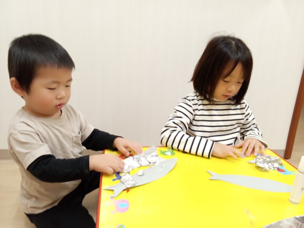 アルミホイルをちぎって、魚の形をした画用紙に貼り付け色を塗って作りました!