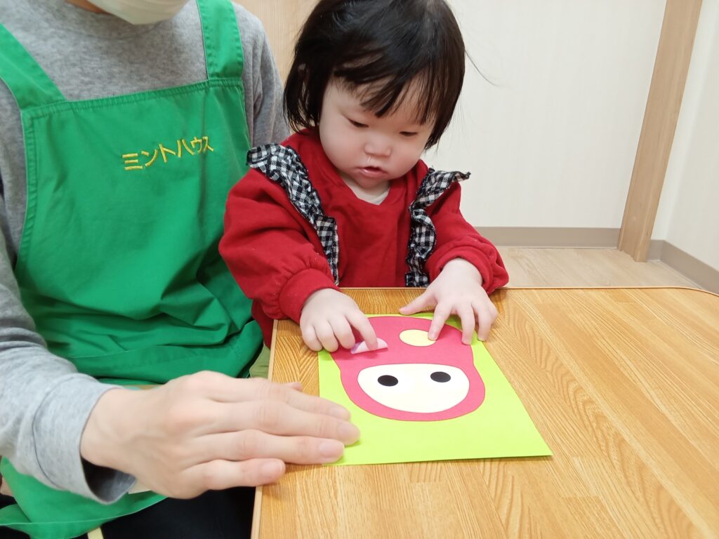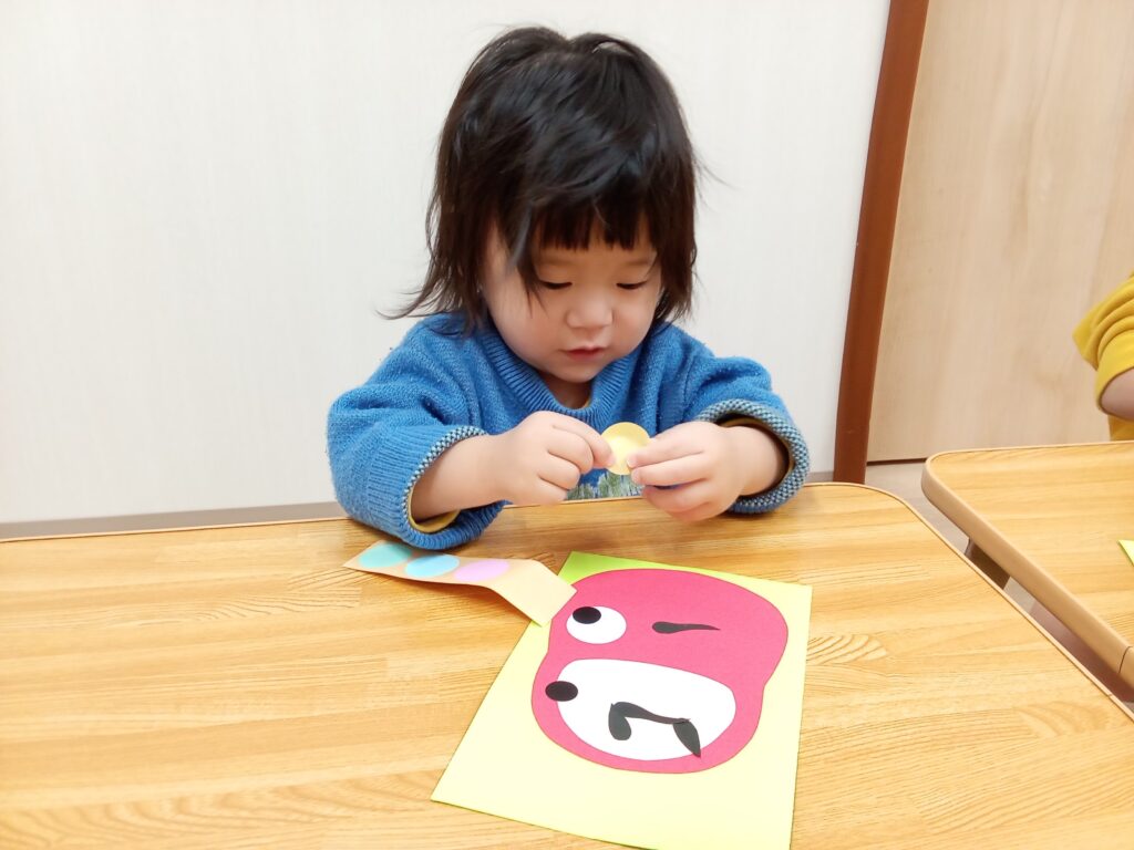 小さいグループさんは、顔のパーツを貼って、パステルカラーのシールで可愛く模様を付けました😄