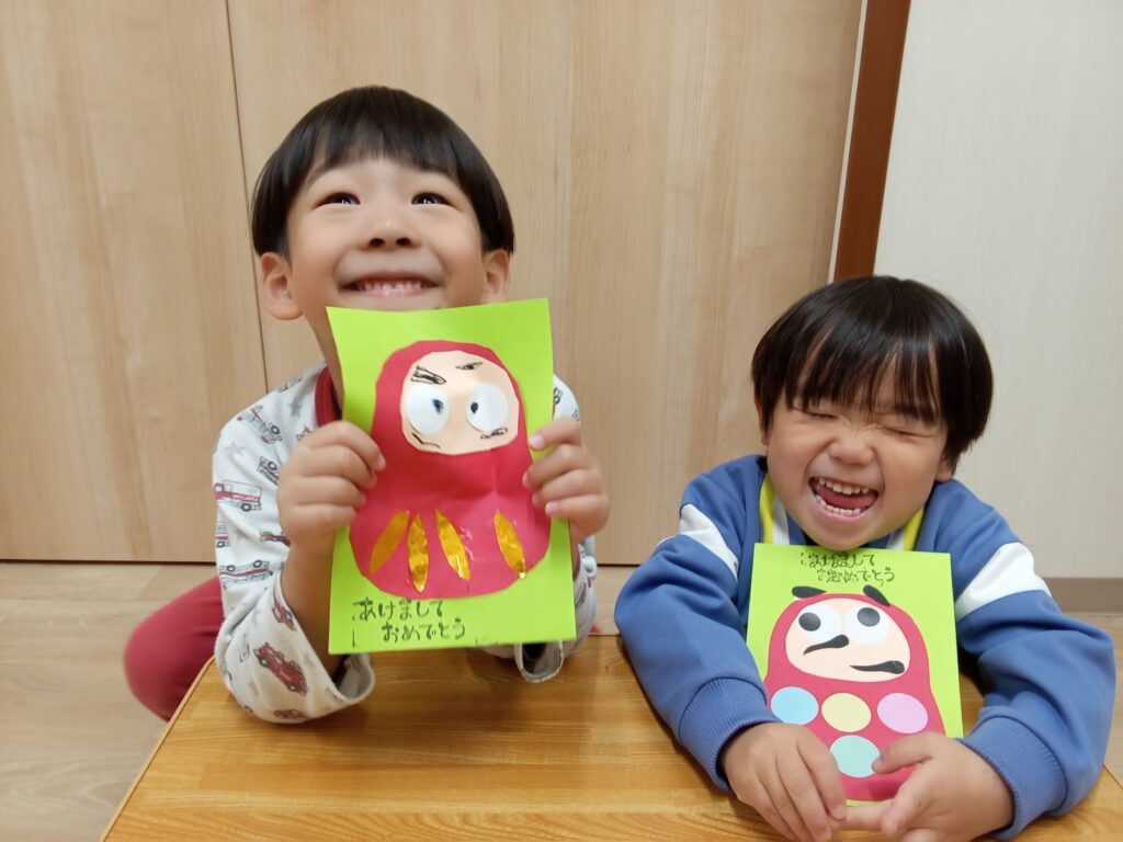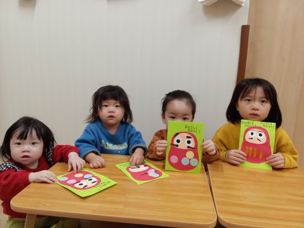 顔の位置も理解して貼れましたよ。大きいグループさんは、だるまの体と顔を切って作りました。