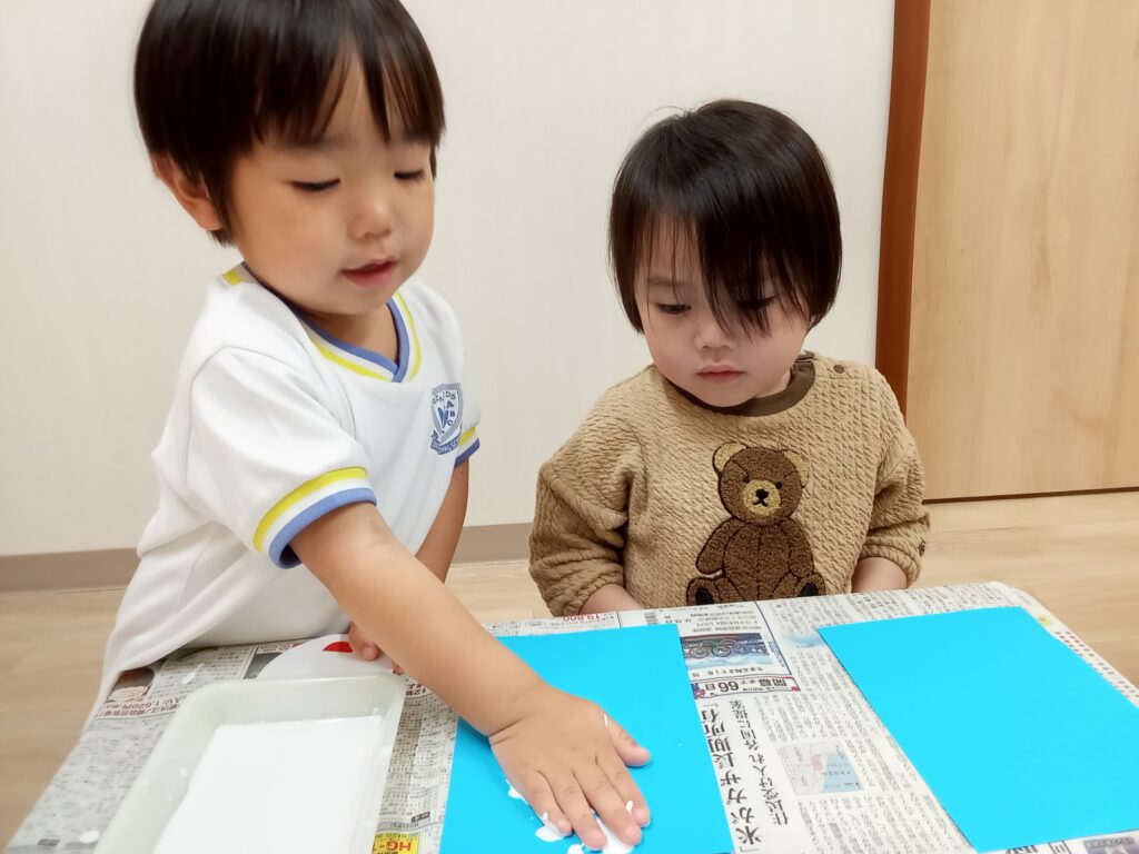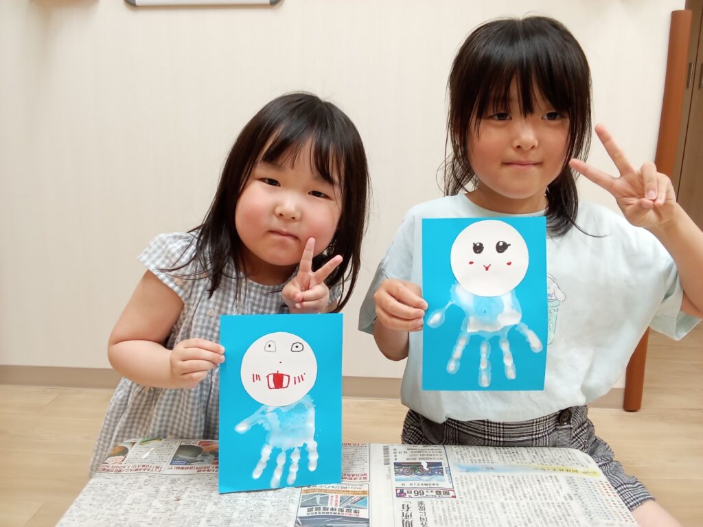 体の手形は、手慣れたもので「冷たっ(笑)」と言いながら絵の具に手を浸してパンッと手形を取っていました🖐️